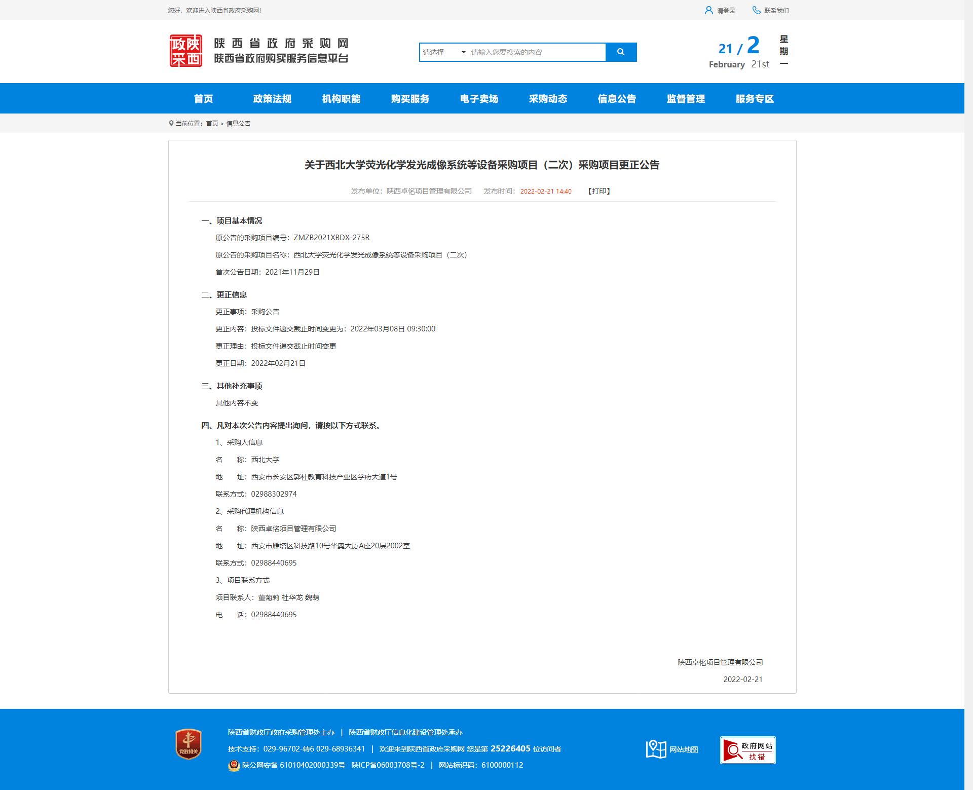 关于乐投平台荧光化学发光成像系统等设备采购项目(二次)采购项目更正公告 作者: 编辑:薛利娟 时间:2022-02-21 原公告链接:http://www.ccgp-shaanxi.gov.cn/notice/noticeDetail.do?noticeguid=8a85be317ee7907d017f1aa113f346e8