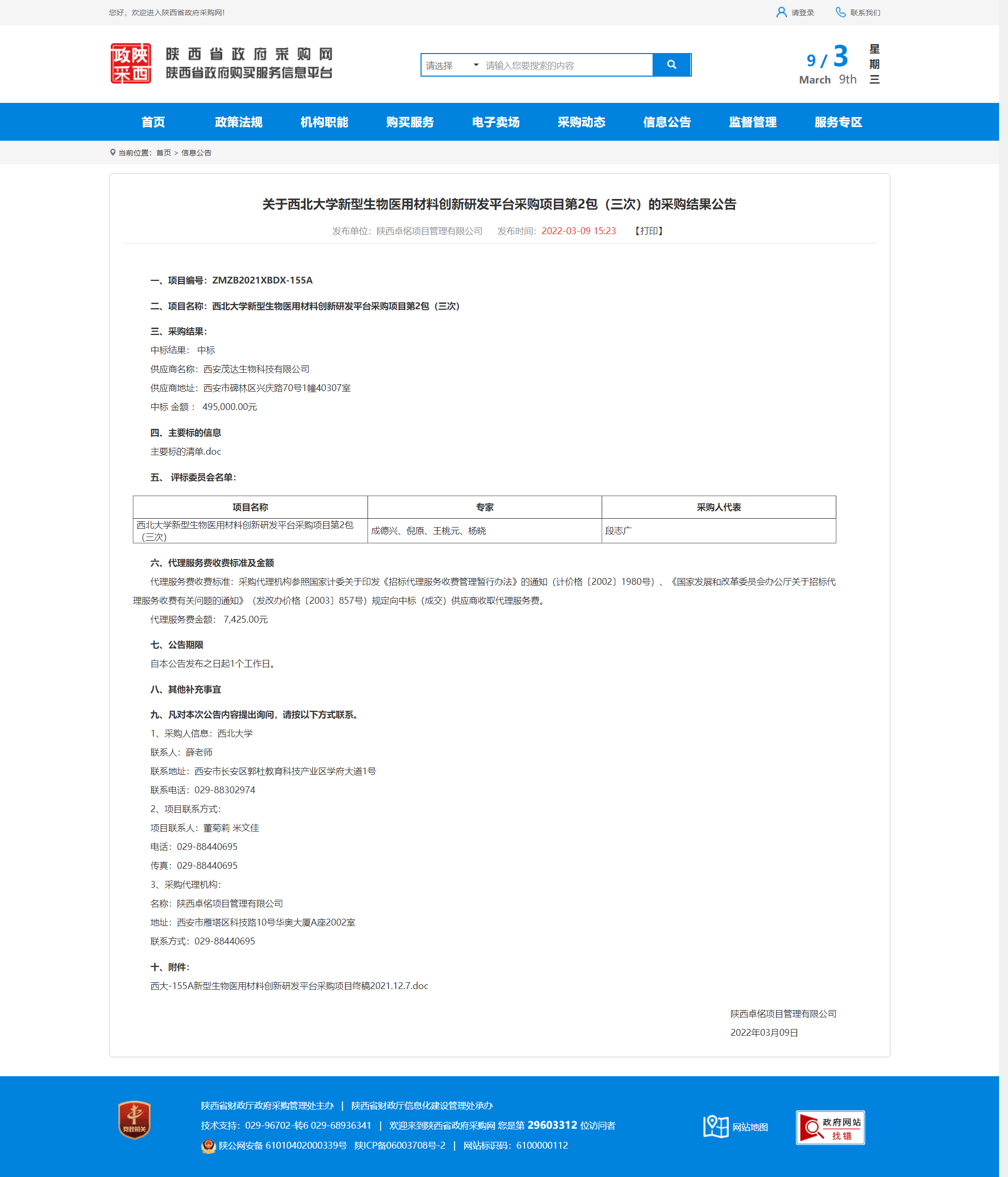 关于乐投平台新型生物医用材料创新研发平台采购项目第2包(三次)的采购结果公告 作者: 编辑:薛利娟 时间:2022-03-09 原公告链接:http://www.ccgp-shaanxi.gov.cn/notice/noticeDetail.do?noticeguid=8a85be317f3fe526017f6d6699050f58
