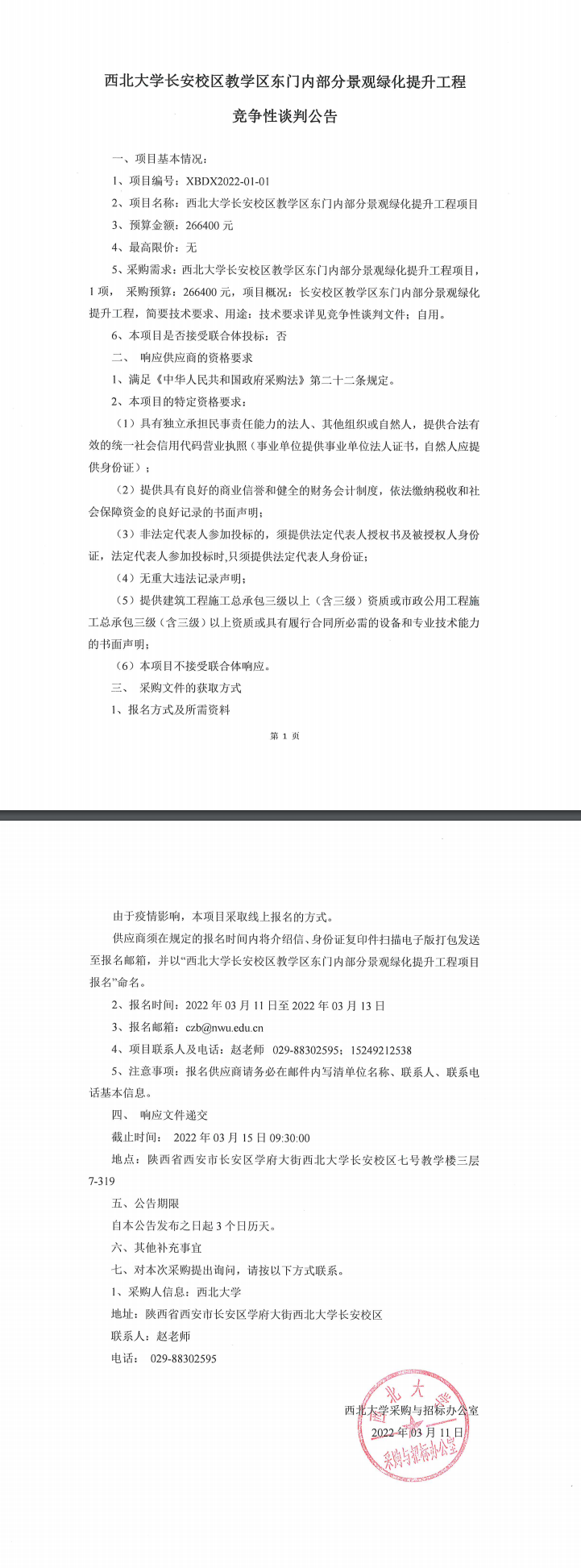 乐投平台长安校区教学区东门内部分景观绿化提升工程竞争性谈判公告