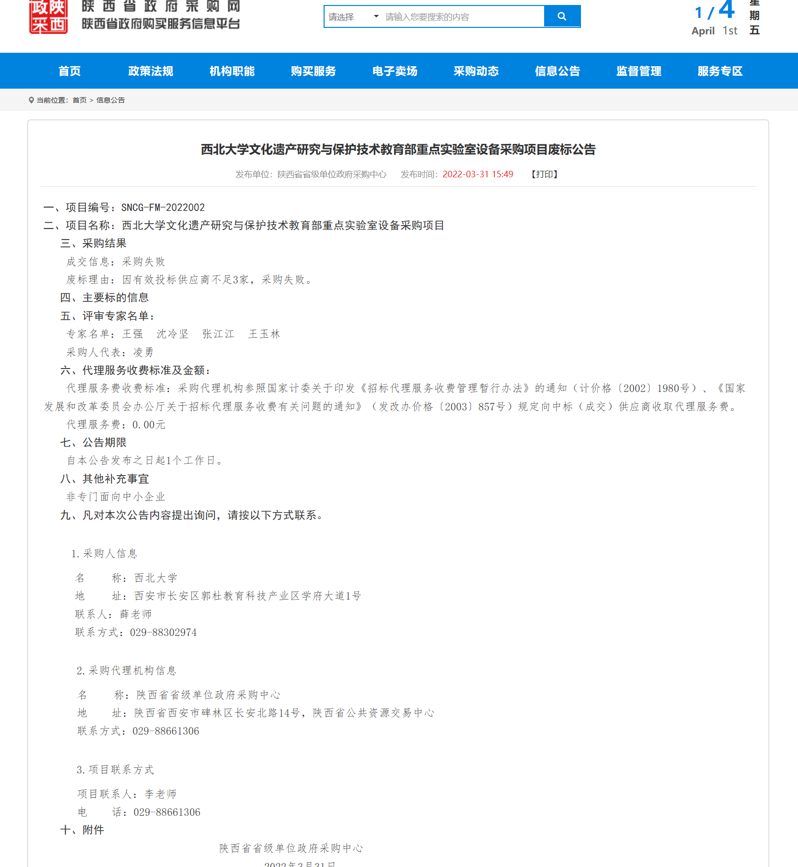 乐投平台文化遗产研究与保护技术教育部重点实验室设备采购项目废标公告 作者: 编辑:薛利娟 时间:2022-04-01 原公告链接:http://113.200.80.230/notice/noticeDetail.do?noticeguid=8a85be387f91f0bf017fdf327dfa001b