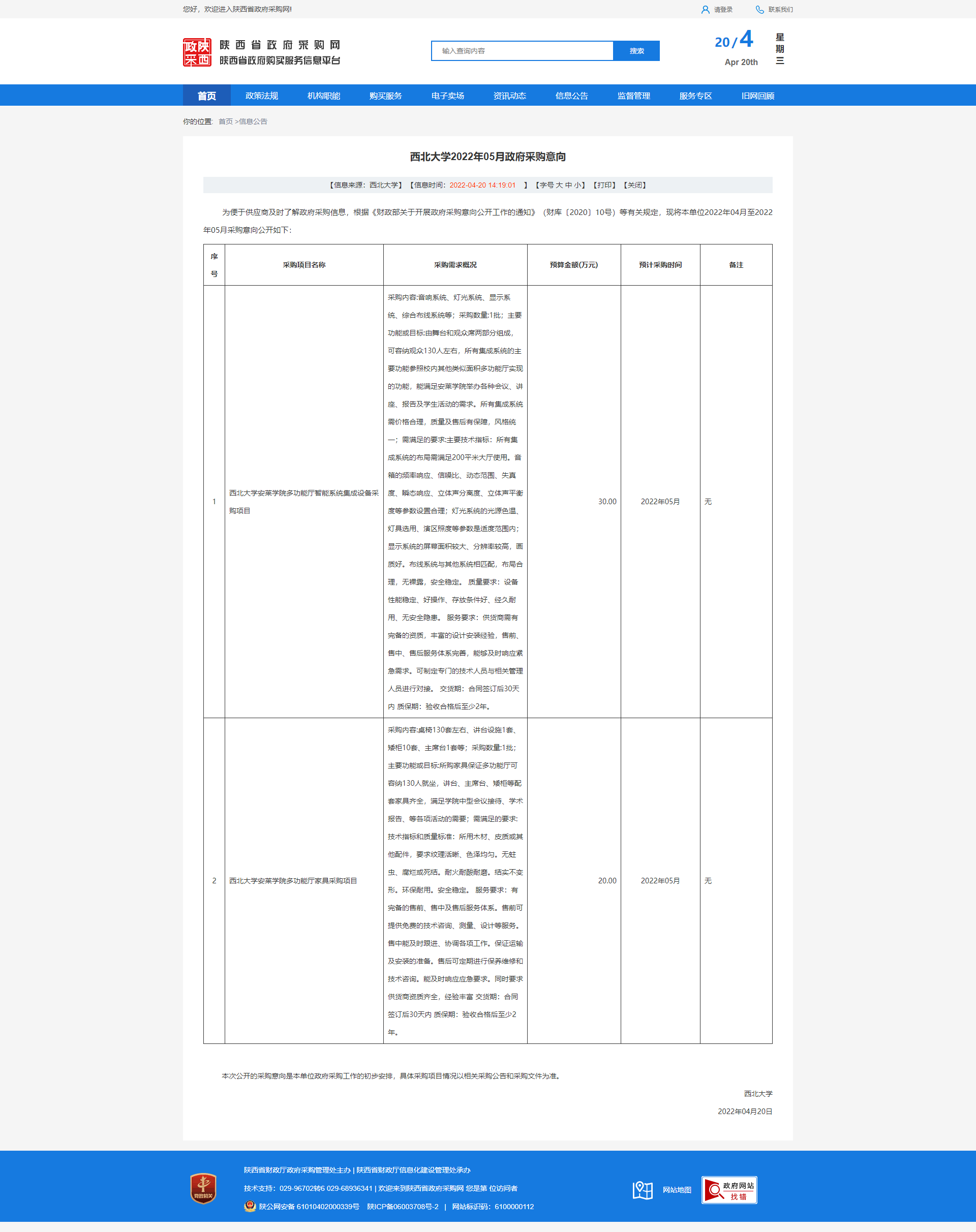 乐投平台2022年05月政府采购意向 作者: 编辑:薛利娟 时间:2022-04-20 原公告链接:http://www.ccgp-shaanxi.gov.cn/freecms/site/shaanxi/ggxx/info/2022/8a69c6fa803f5d71018044f8ef4371e6.html?noticeType=59¬iceId=ec2f07d2-c071-11ec-9a8e-08c0eb20c666