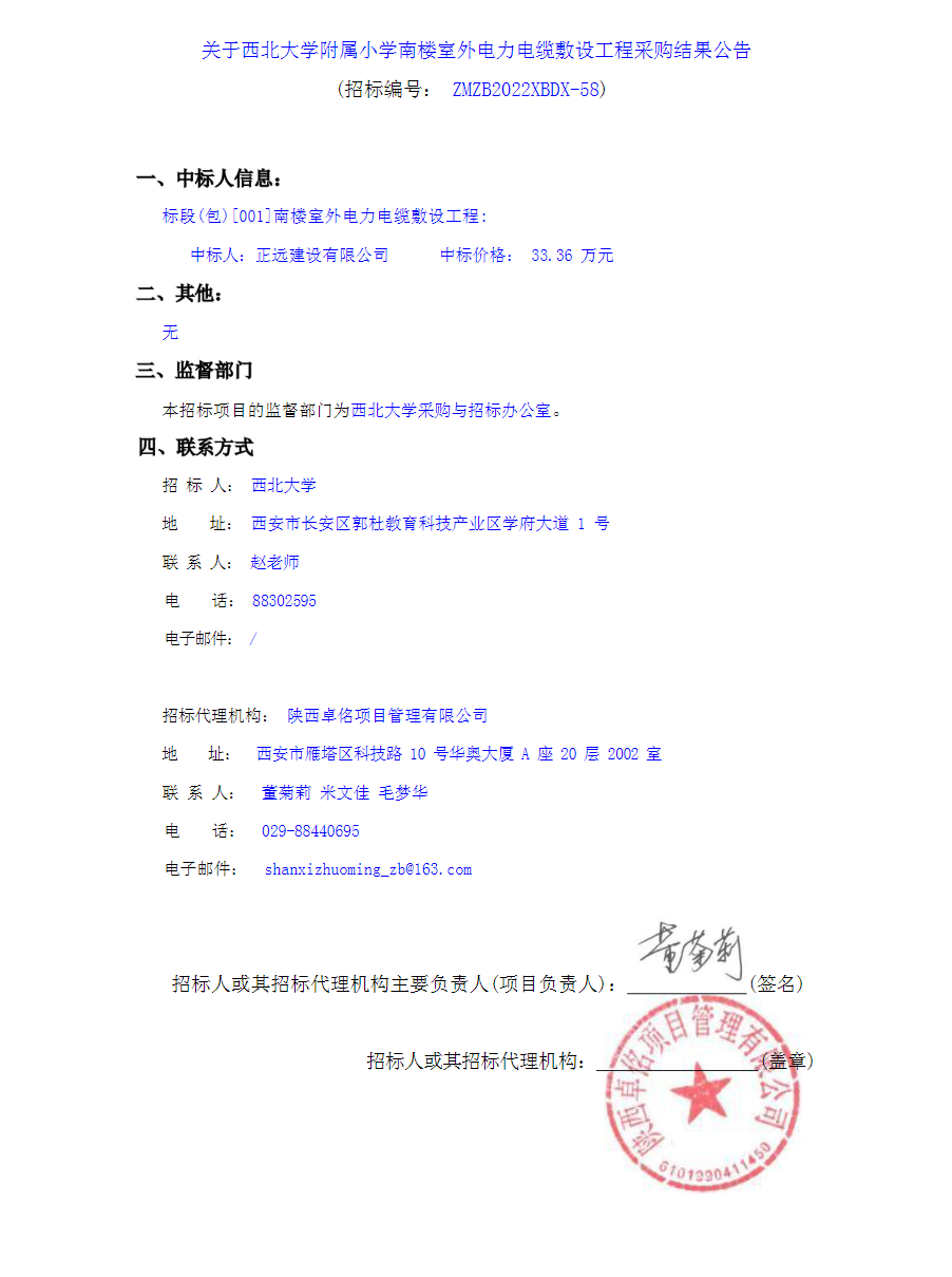 关于乐投平台附属小学南楼室外电力电缆敷设工程采购结果公告