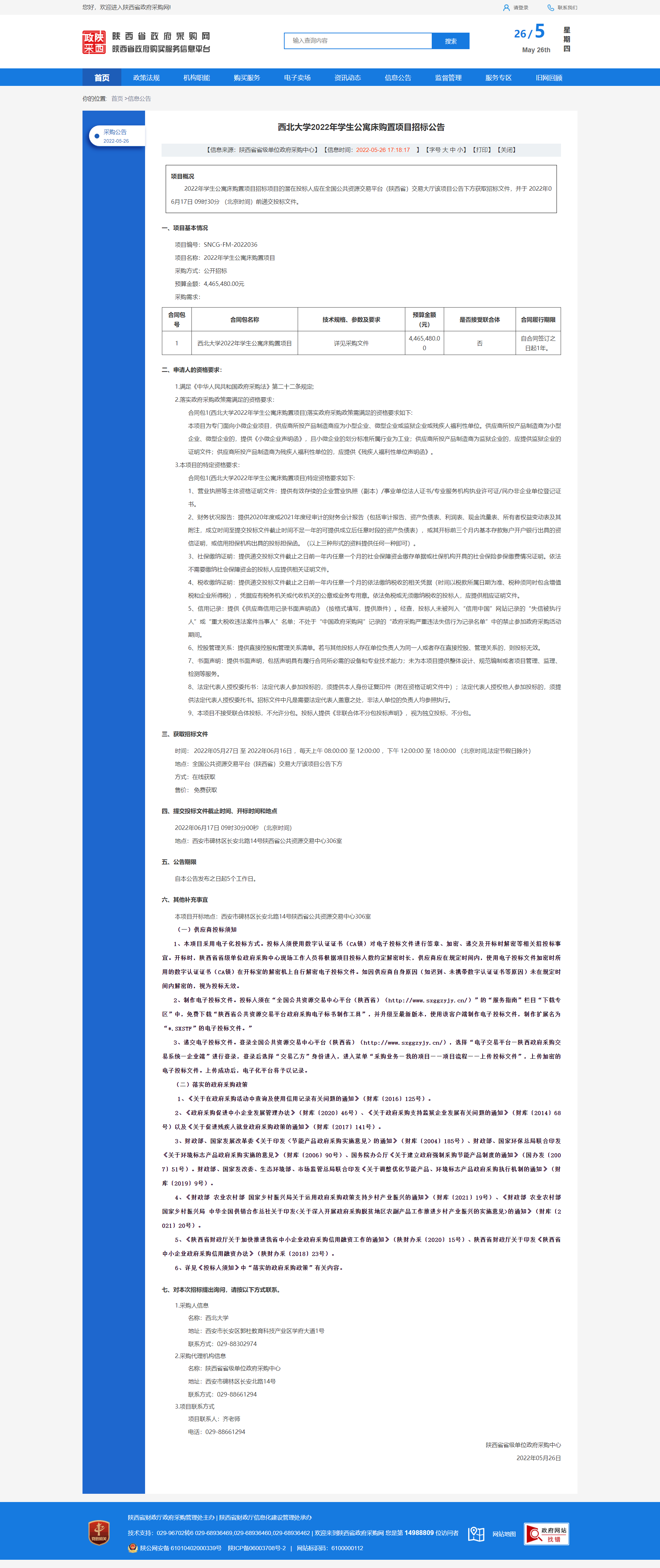 乐投平台2022年学生公寓床购置项目招标公告 作者: 编辑:薛利娟 时间:2022-05-26 原公告链接:http://www.ccgp-shaanxi.gov.cn/freecms/site/shaanxi/ggxx/info/2022/8a69c34a80cf8c1d0180d6127e5a14f4.html?noticeType=001011¬iceId=0697247a-dcd5-11ec-9a8e-08c0eb20c666