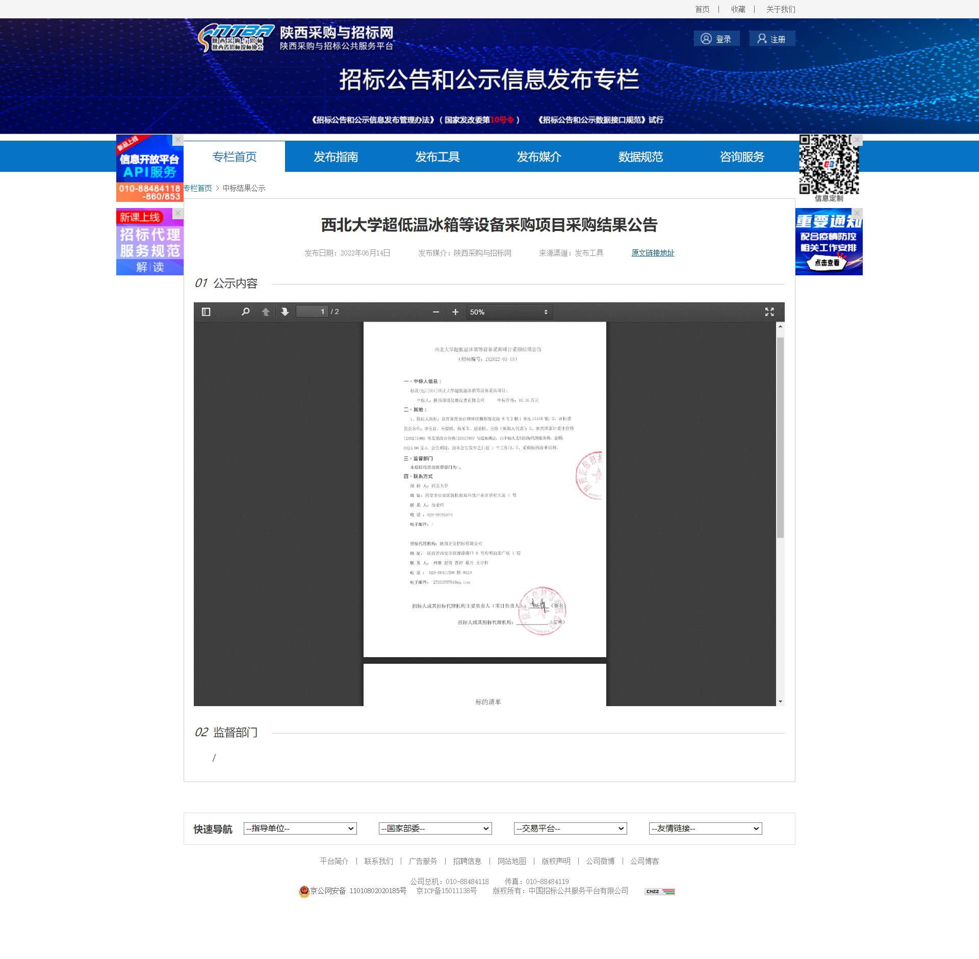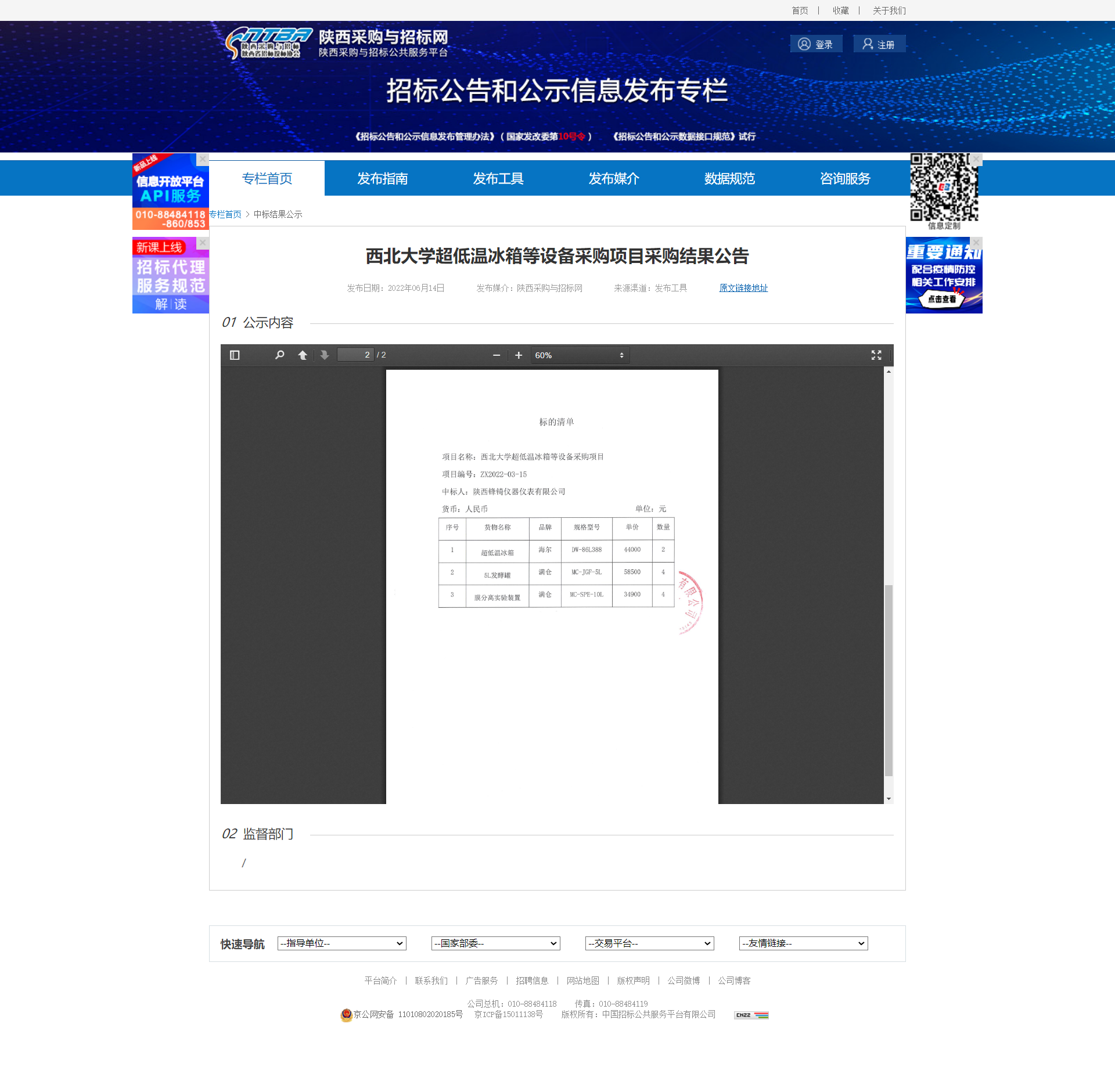 乐投平台超低温冰箱等设备采购项目采购结果公告 作者: 编辑:薛利娟 时间:2022-06-14 原公告链接:http://bulletin.sntba.com/resultBulletin/2022-06-14/433311.html
