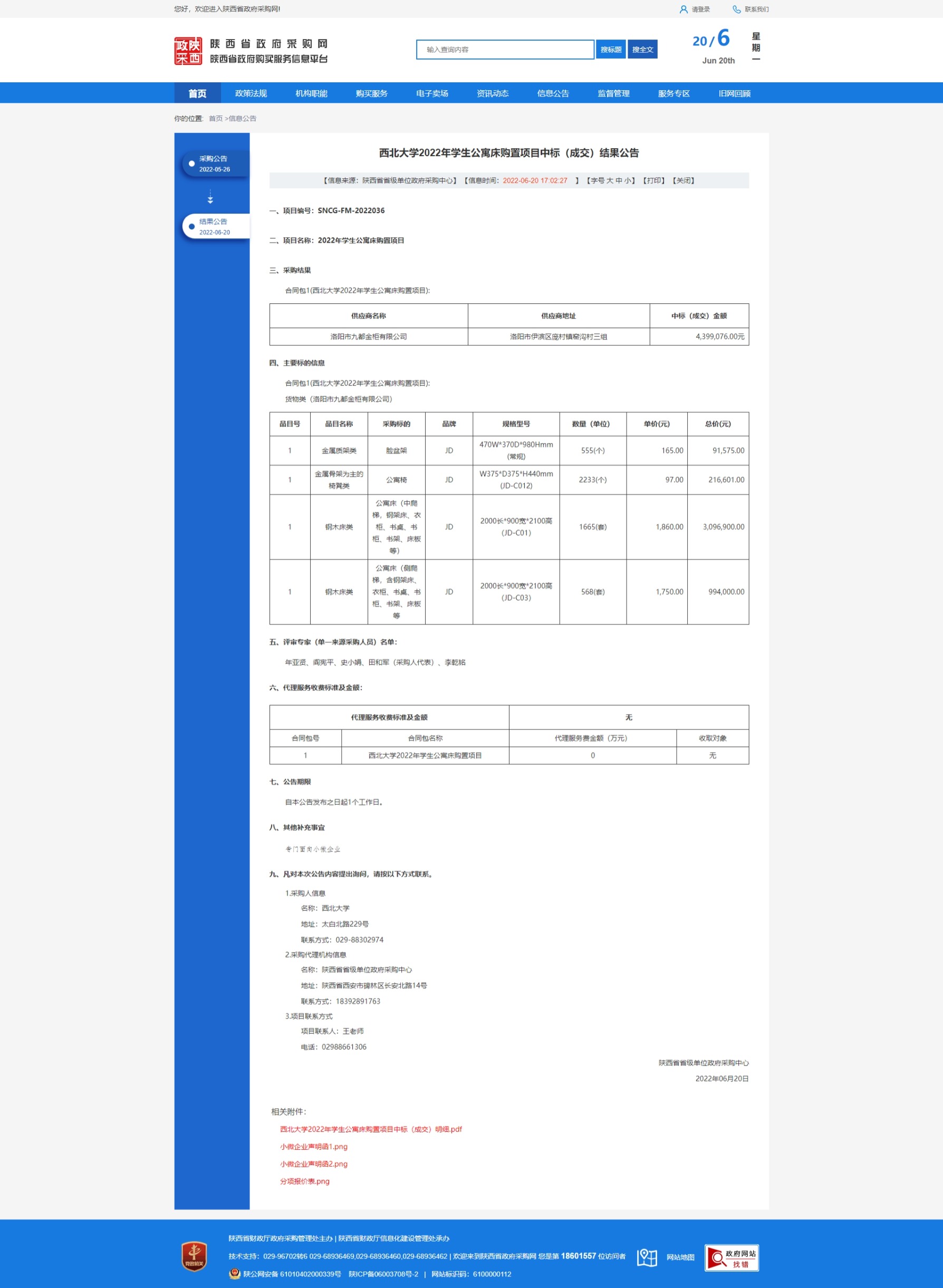 乐投平台2022年学生公寓床购置项目中标(成交)结果公告 作者: 编辑:薛利娟 时间:2022-06-20 原公告链接:http://www.ccgp-shaanxi.gov.cn/freecms/site/shaanxi/ggxx/info/2022/8a69c8f3812f549f01817fdf5cbb0b94.html?noticeType=001021¬iceId=04d8eb59-f078-11ec-9a8e-08c0eb20c666