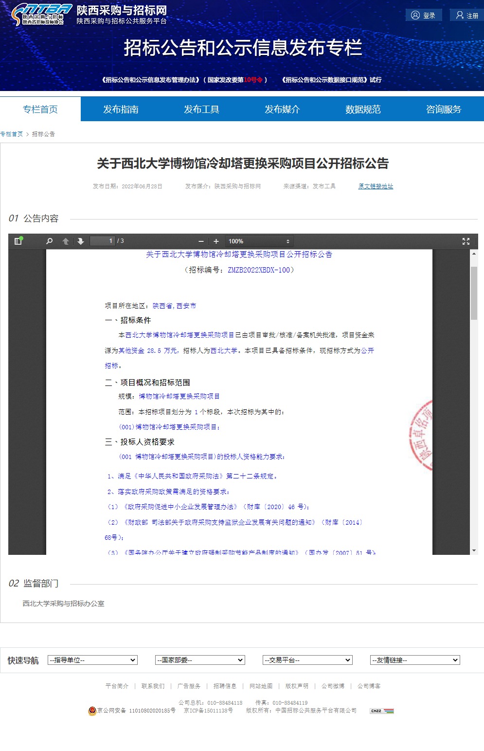 关于乐投平台博物馆冷却塔更换采购项目公开招标公告 作者: 编辑:采购与招标办公室 时间:2022-06-28 原公告链接:http://bulletin.sntba.com/biddingBulletin/2022-06-28/439809.html