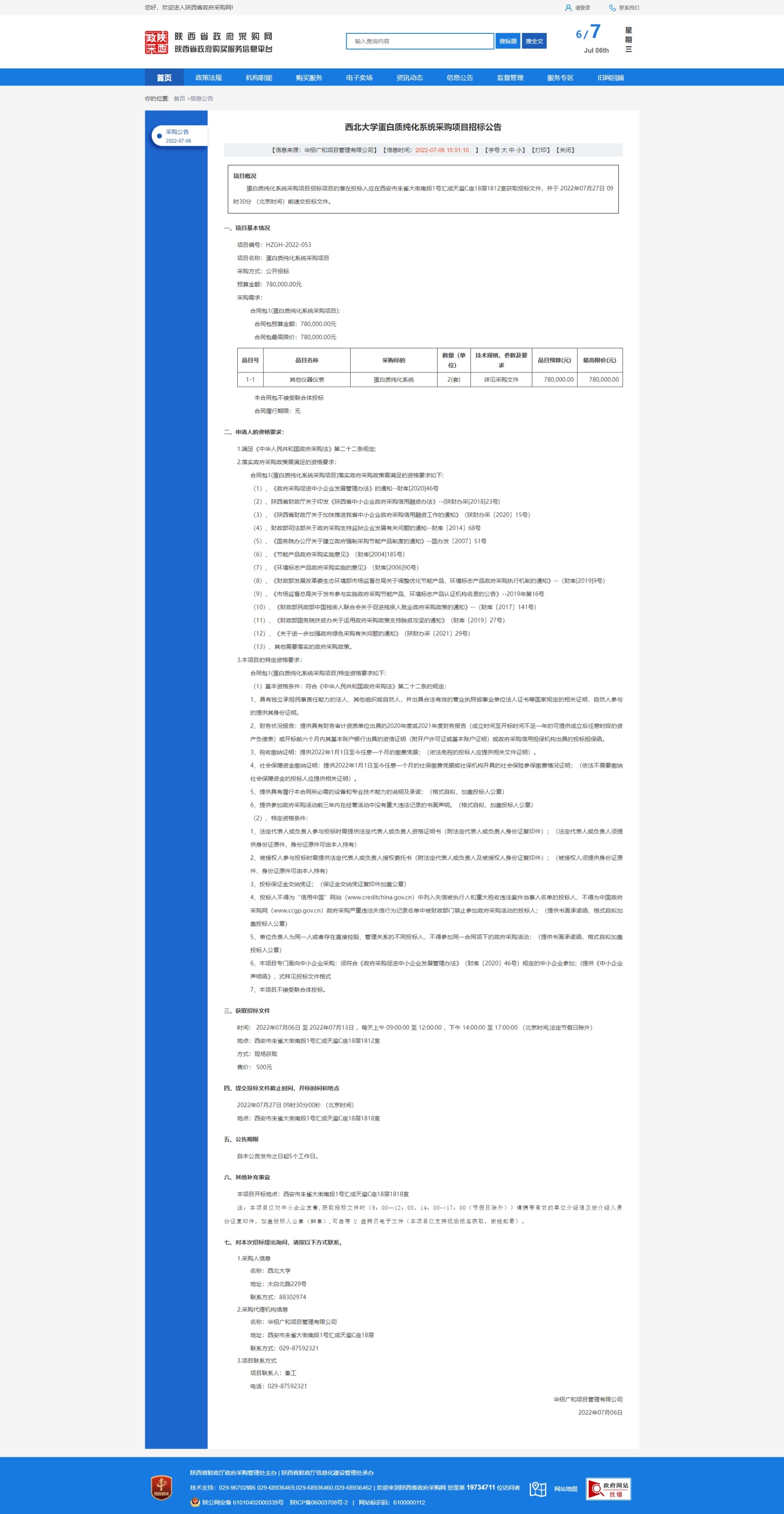 乐投平台蛋白质纯化系统采购项目招标公告 作者: 编辑:采购与招标办公室 时间:2022-07-06 原公告链接:http://www.ccgp-shaanxi.gov.cn/freecms/site/shaanxi/ggxx/info/2022/8a69c8f3812f549f0181d26b968a5f80.html?noticeType=001011¬iceId=bfc1034f-fd00-11ec-9a8e-08c0eb20c666