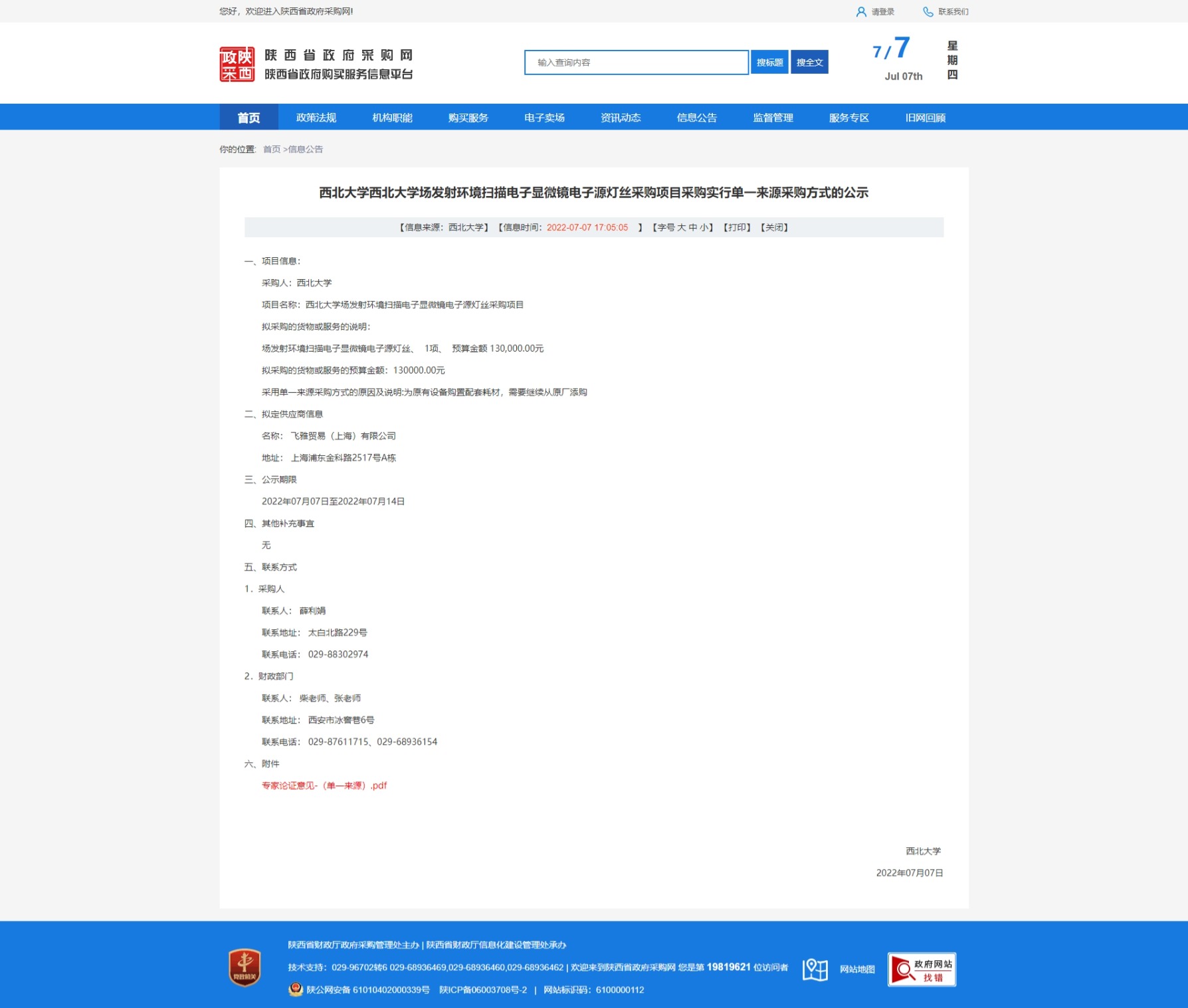 乐投平台场发射环境扫描电子显微镜电子源灯丝采购项目采购实行单一来源采购方式的公示 作者: 编辑:薛利娟 时间:2022-07-07 原公告链接:http://www.ccgp-shaanxi.gov.cn/freecms/site/shaanxi/ggxx/info/2022/8a69c98381d796930181d7db0fcb3096.html?noticeType=001051¬iceId=3e7bb0b7-fdd4-11ec-9a8e-08c0eb20c666