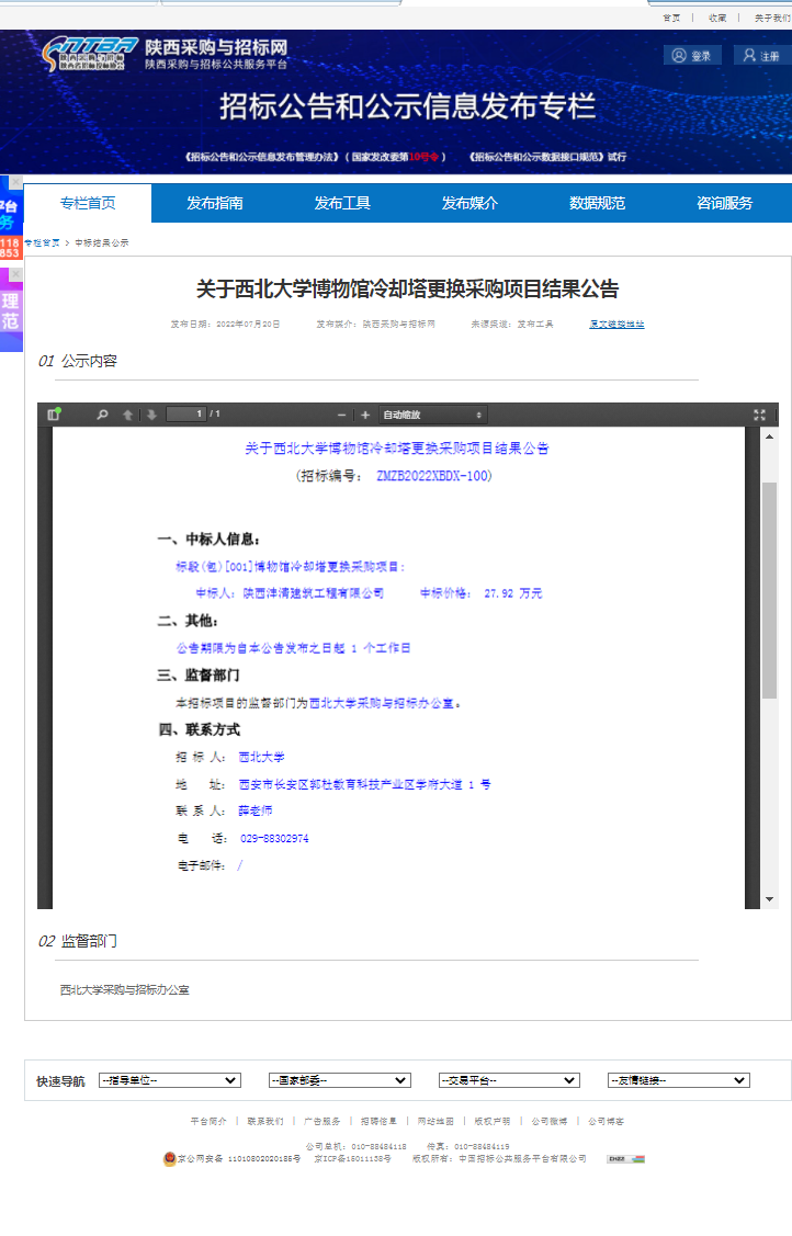 关于乐投平台博物馆冷却塔更换采购项目结果公告 作者: 编辑:薛利娟 时间:2022-07-21 原公告链接:http://bulletin.sntba.com/resultBulletin/2022-07-20/450093.html
