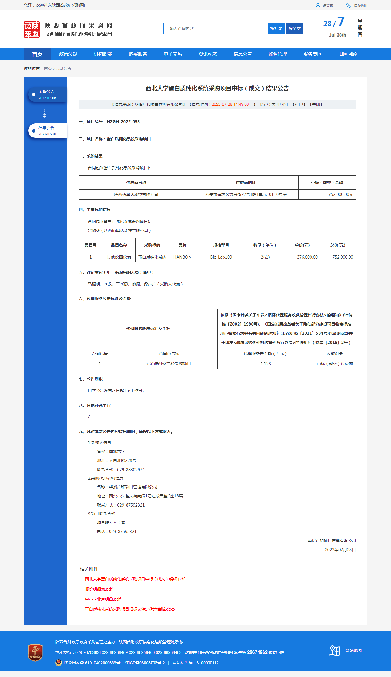 乐投平台蛋白质纯化系统采购项目中标(成交)结果公告 作者: 编辑:采购与招标办公室 时间:2022-07-28 原公告链接:http://www.ccgp-shaanxi.gov.cn/freecms/site/shaanxi/ggxx/info/2022/8a69c0168238f2d801824386c2a86160.html?noticeType=001021¬iceId=c4ccf243-0e41-11ed-9a8e-08c0eb20c666