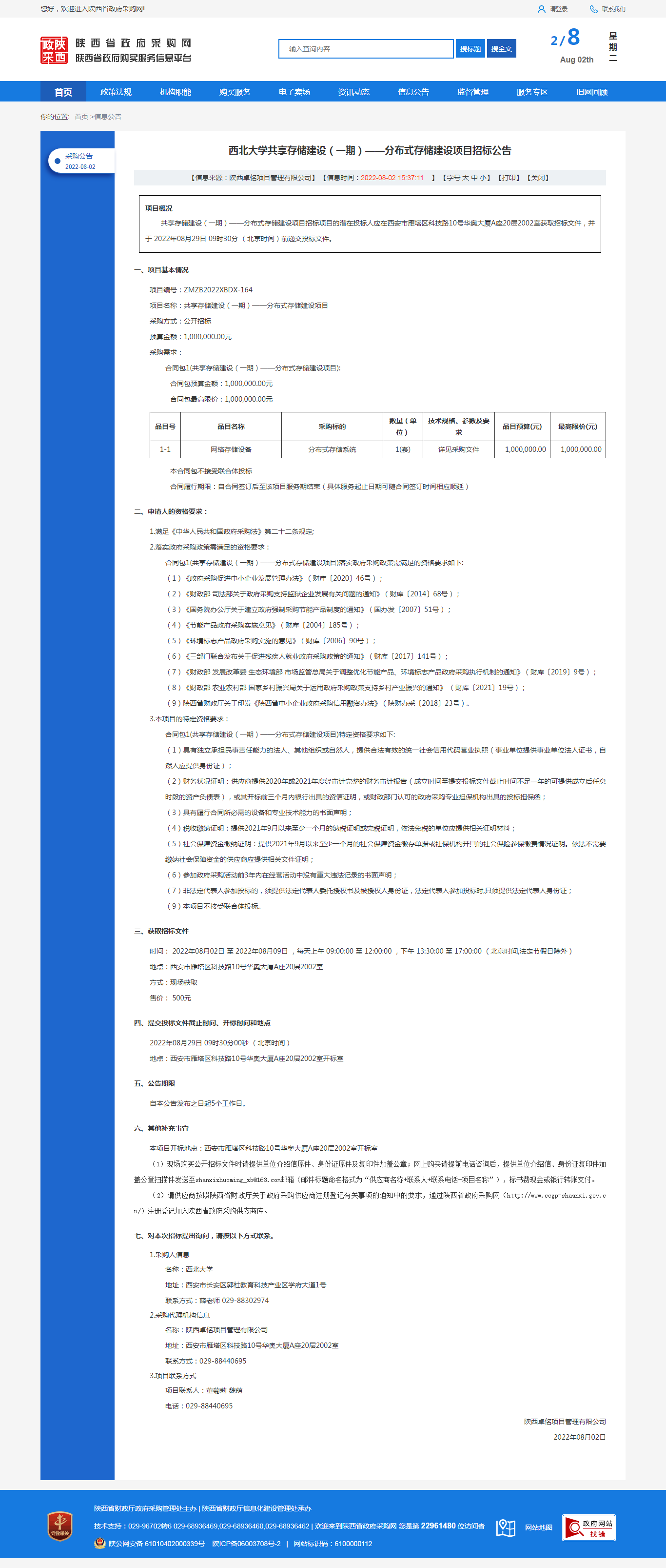 乐投平台共享存储建设(一期)——分布式存储建设项目招标公告 作者: 编辑:采购与招标办公室 时间:2022-08-02 原公告链接:http://www.ccgp-shaanxi.gov.cn/freecms/site/shaanxi/ggxx/info/2022/8a69c8308238f00301825cf936ec1904.html?noticeType=001011¬iceId=565bf0b7-1236-11ed-9a8e-08c0eb20c666