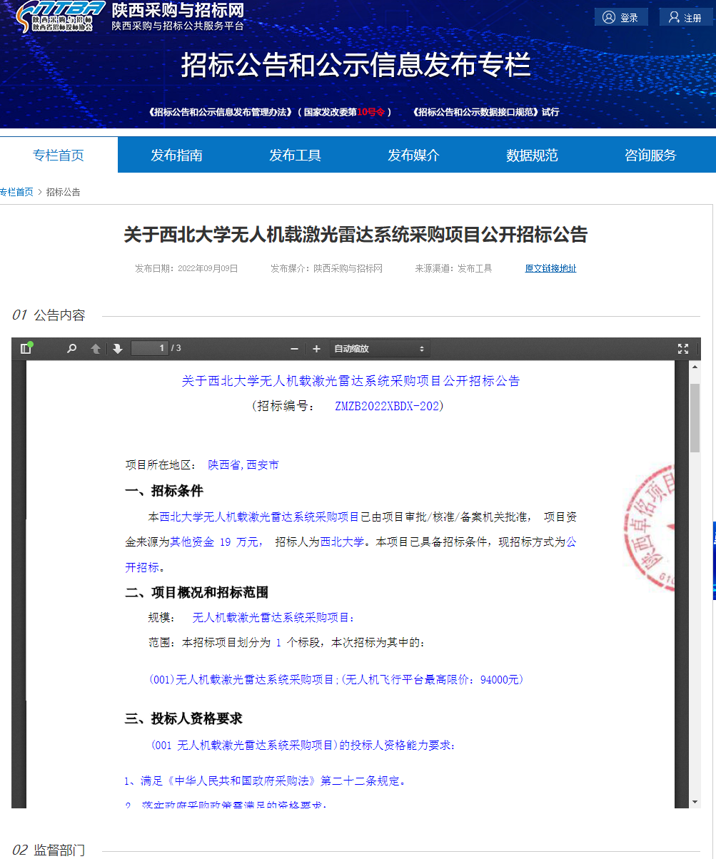 关于乐投平台无人机载激光雷达系统采购项目公开招标公告 作者: 编辑:关于乐投平台无人机载激光雷达系统采购项目公开招标公告 时间:2022-09-09 原公告链接:http://bulletin.sntba.com/biddingBulletin/2022-09-09/472755.html
