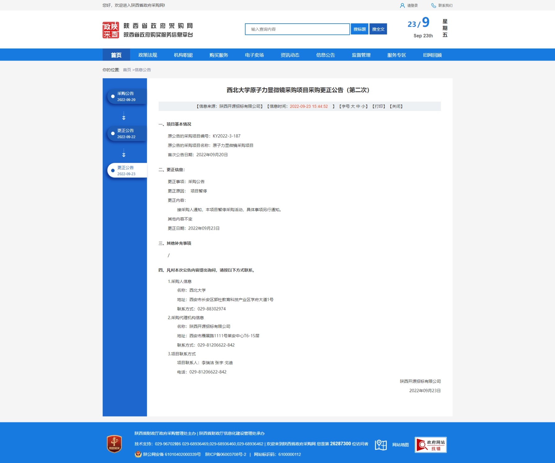 乐投平台原子力显微镜采购项目采购更正公告(第二次) 作者: 编辑:采购与招标办公室 时间:2022-09-23 原公告链接:http://www.ccgp-shaanxi.gov.cn/freecms/site/shaanxi/ggxx/info/2022/8a69c78482a320a201836942a02842b0.html?noticeType=001031¬iceId=22ff8d4b-3b14-11ed-9a8e-08c0eb20c666