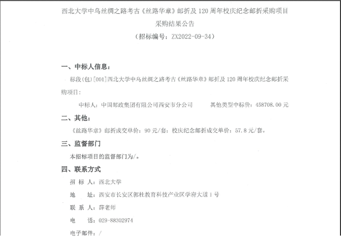 乐投平台中乌丝绸之路考古《丝路华章》邮折及120周年校庆纪念邮折采购项目采购结果公告 作者: 编辑:采购与招标办公室 时间:2022-10-09 原公告链接:http://bulletin.sntba.com/resultBulletin/2022-10-08/482720.html