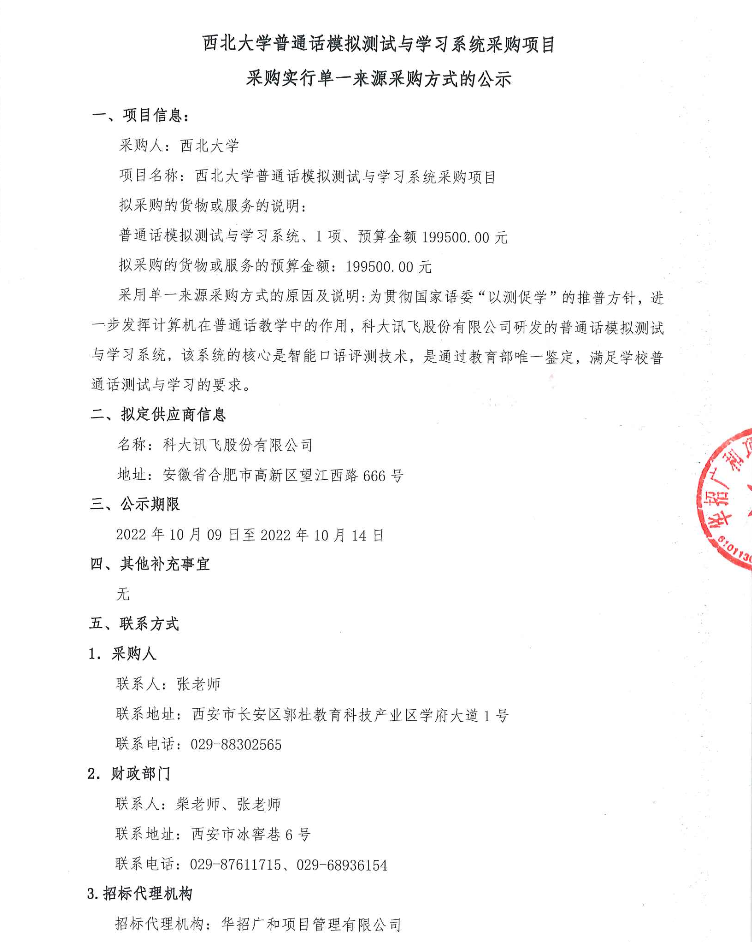 乐投平台普通话模拟测试与学习系统采购项目采购实行单一来源采购方式的公示