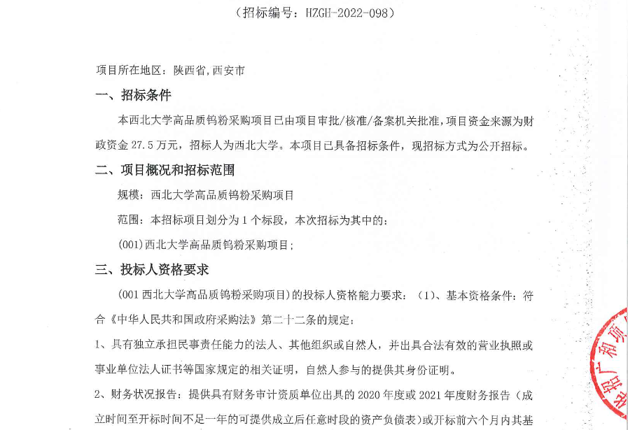 乐投平台高品质钨粉采购项目公开招标公告 作者: 编辑:采购与招标办公室 时间:2022-11-23 原公告链接:http://bulletin.sntba.com/biddingBulletin/2022-11-23/502149.html