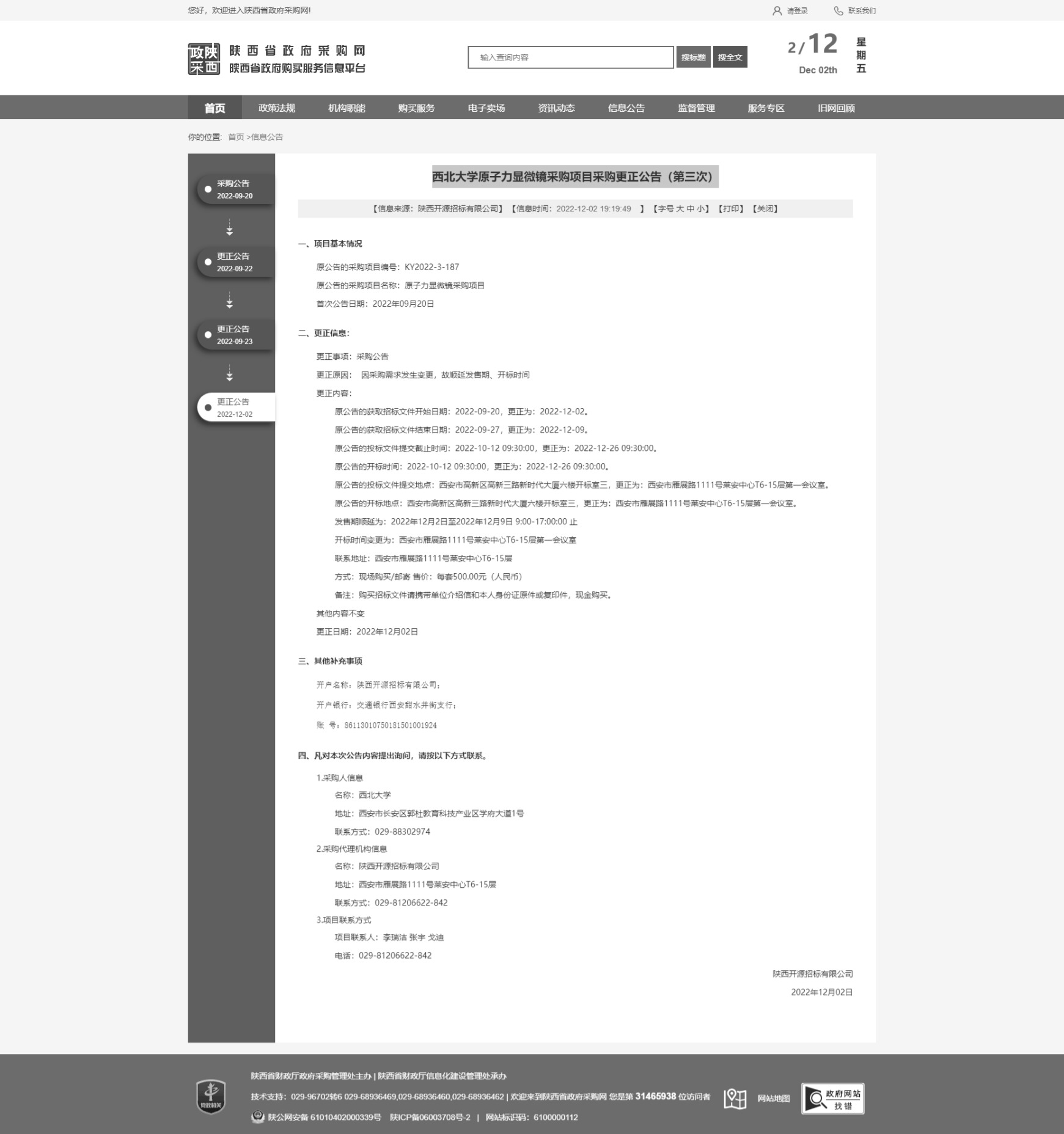 乐投平台原子力显微镜采购项目采购更正公告(第三次) 作者: 编辑:采购与招标办公室 时间:2022-12-02 原公告链接:http://www.ccgp-shaanxi.gov.cn/freecms/site/shaanxi/ggxx/info/2022/8a69c4c88405ac2f0184d27d406137d7.html?noticeType=001031¬iceId=e90e6533-7233-11ed-9a8e-08c0eb20c666