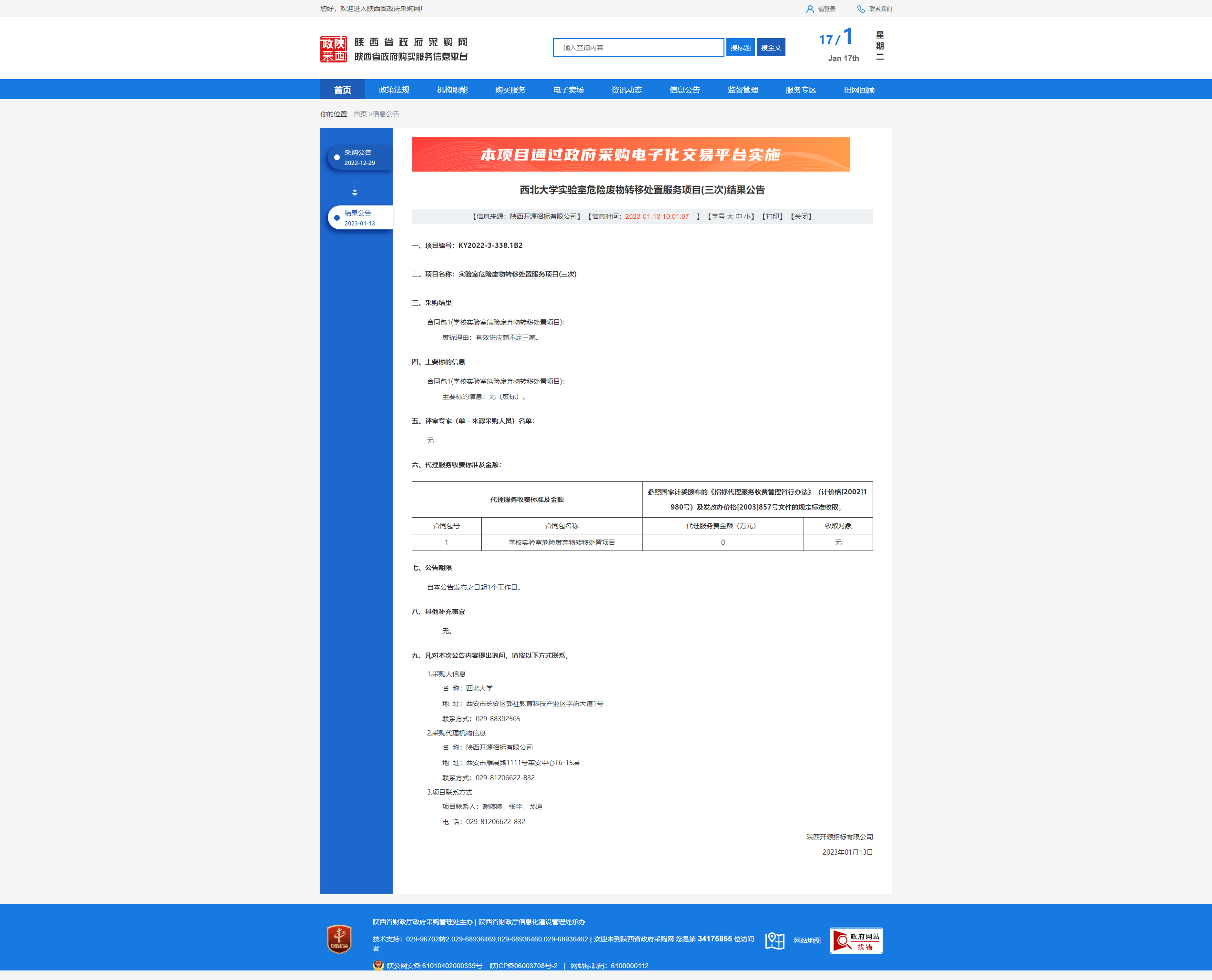 乐投平台实验室危险废物转移处置服务项目(三次)结果公告