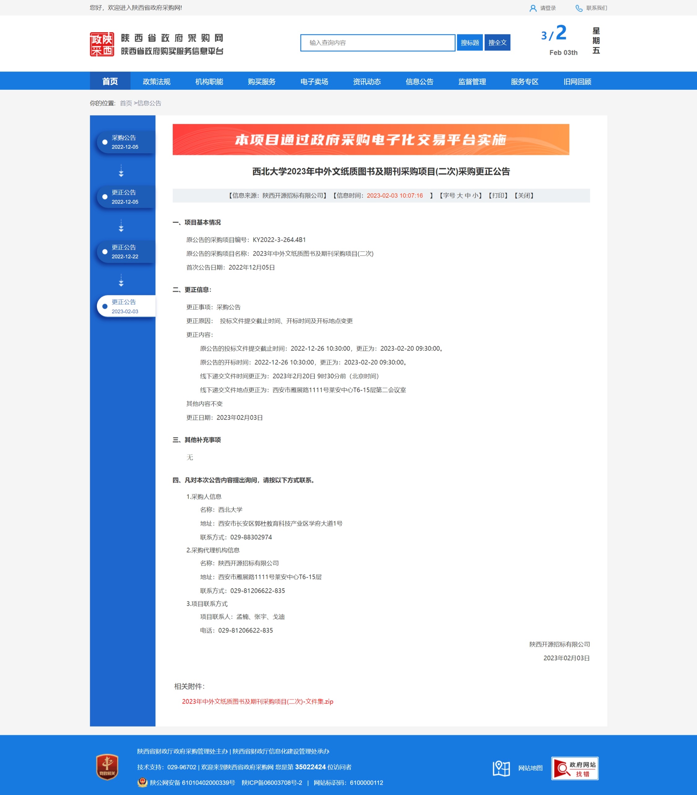 乐投平台2023年中外文纸质图书及期刊采购项目(二次)采购更正公告 作者: 编辑:采购与招标办公室 时间:2023-02-03 原公告链接:http://www.ccgp-shaanxi.gov.cn/freecms/site/shaanxi/ggxx/info/2023/8a69c2e7858176f101861168101b5eb5.html?noticeType=001031¬iceId=49f867d9-a368-11ed-9a8e-08c0eb20c666