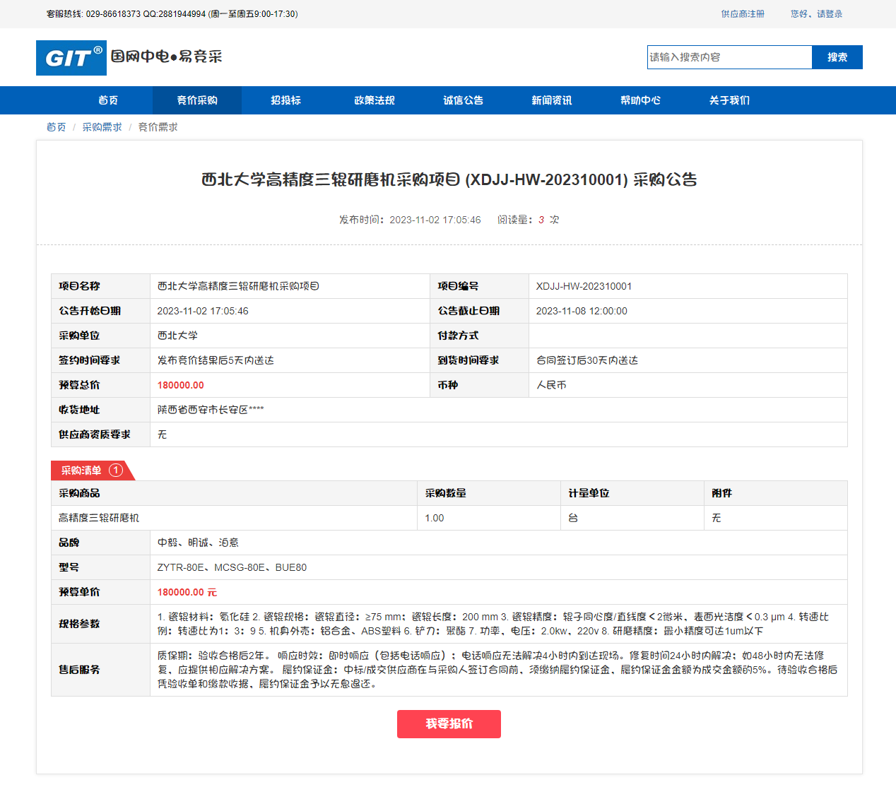 乐投平台高精度三辊研磨机采购项目竞价公告