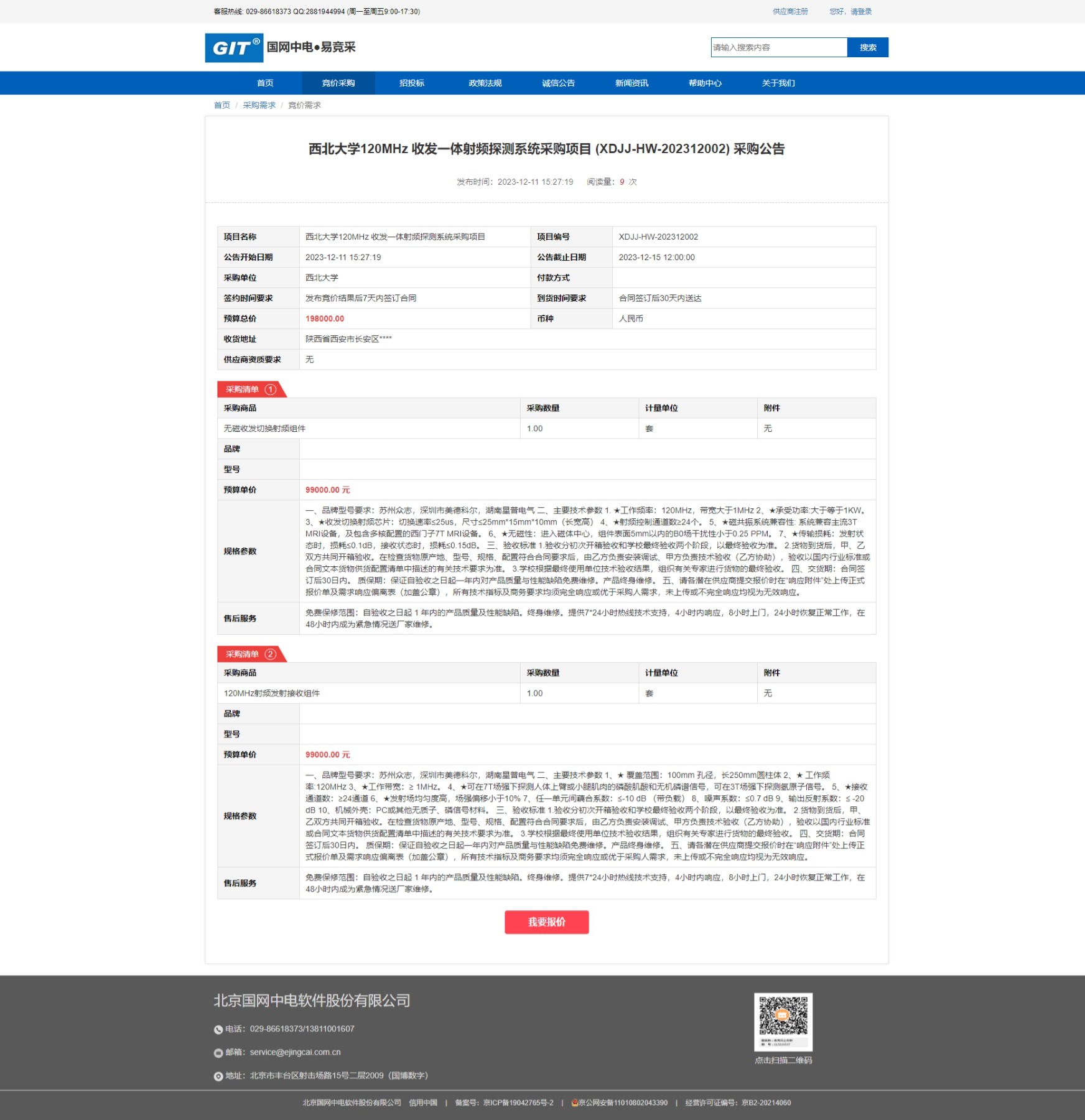 乐投平台120MHz 收发一体射频探测系统采购项目 (XDJJ-HW-202312002) 采购公告 作者: 编辑: 时间:2023-12-12 原公告链接:https://www.ejingcai.com.cn/site/bidding/detail/7715