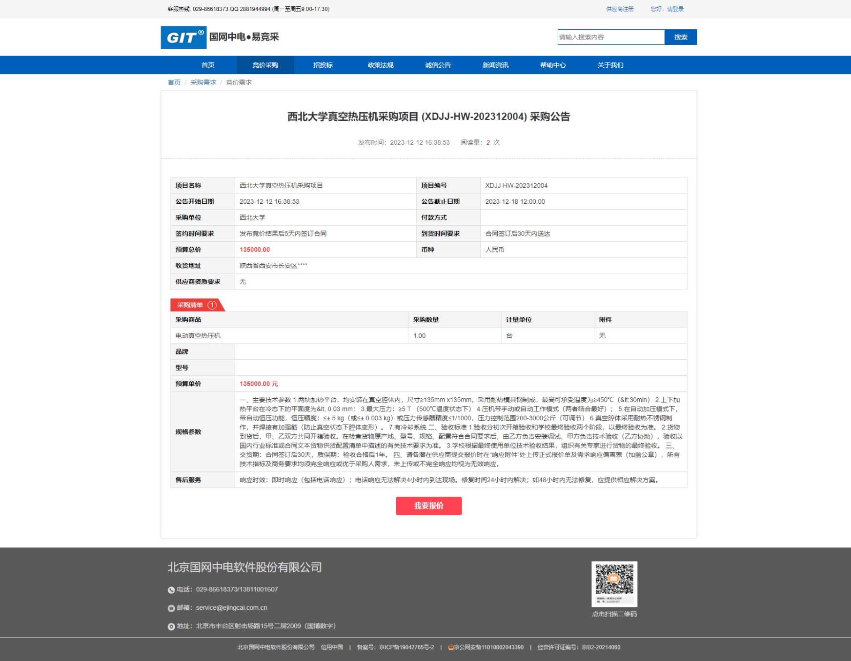 乐投平台真空热压机采购项目 (XDJJ-HW-202312004) 采购公告 作者: 编辑:采购与招标办公室 时间:2023-12-12 原公告链接:https://www.ejingcai.com.cn/site/bidding/detail/7765