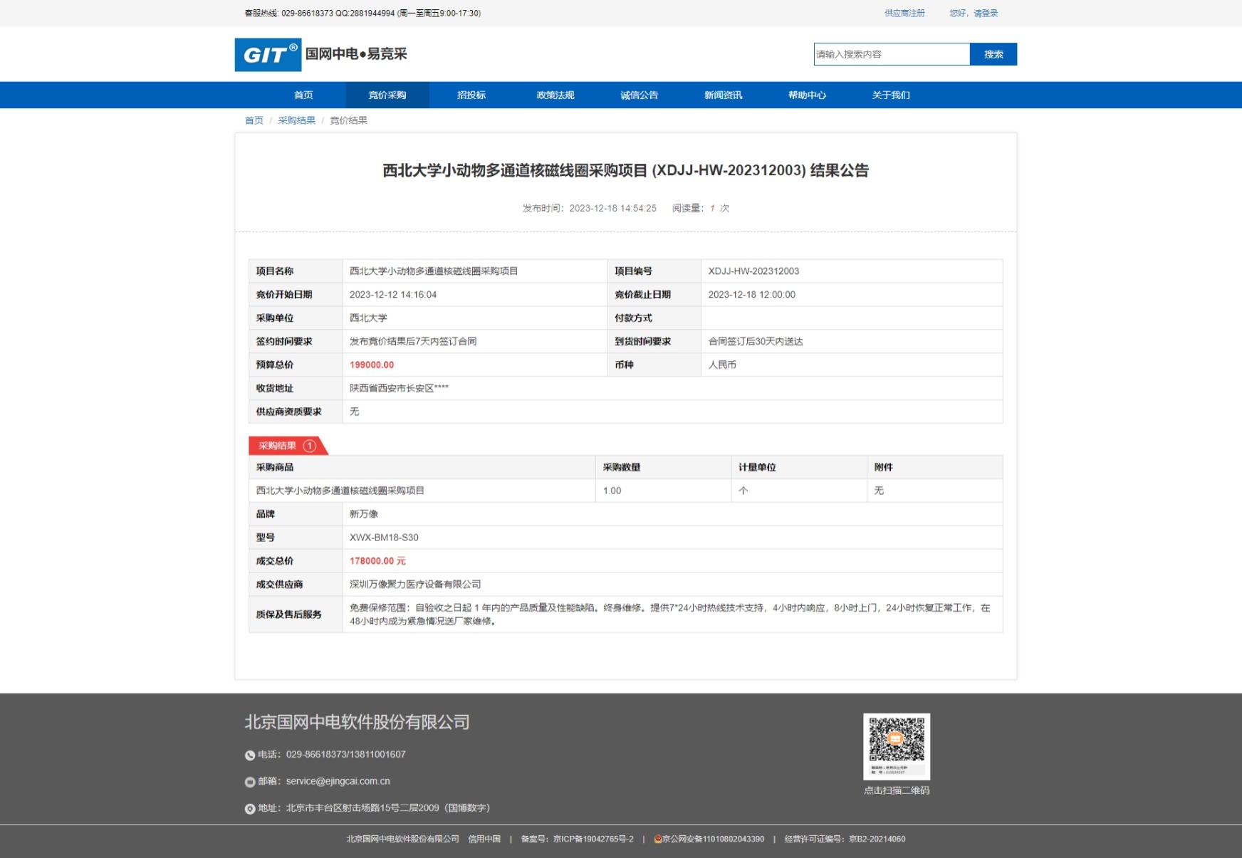 乐投平台小动物多通道核磁线圈采购项目 (XDJJ-HW-202312003) 结果公告 作者: 编辑:采购与招标办公室 时间:2023-12-18 原公告链接:https://www.ejingcai.com.cn/site/bidding/detail/7904