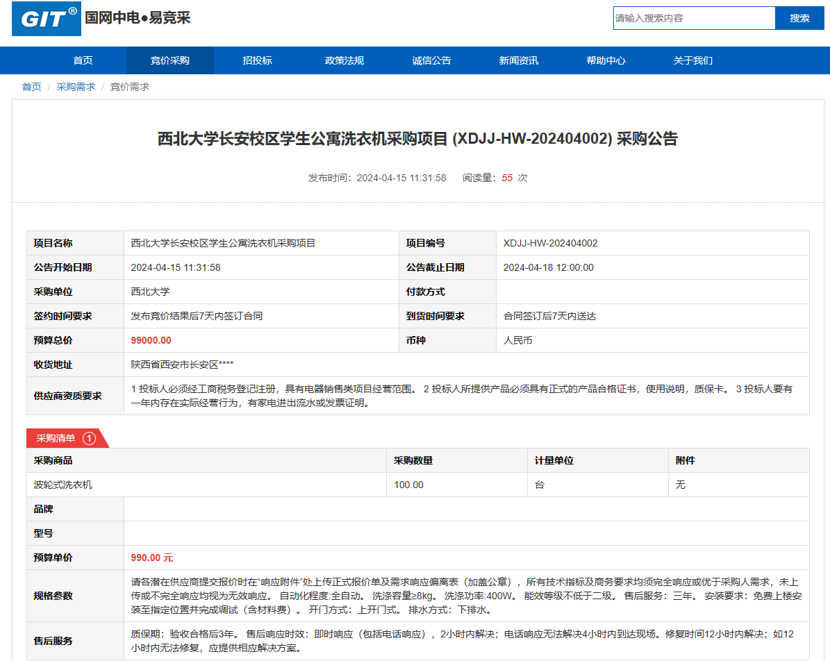 乐投平台长安校区学生公寓洗衣机采购项目 (XDJJ-HW-202404002) 竞价公告 作者: 编辑: 时间:2024-04-16 原公告链接:https://www.ejingcai.com.cn/site/bidding/detail/9485