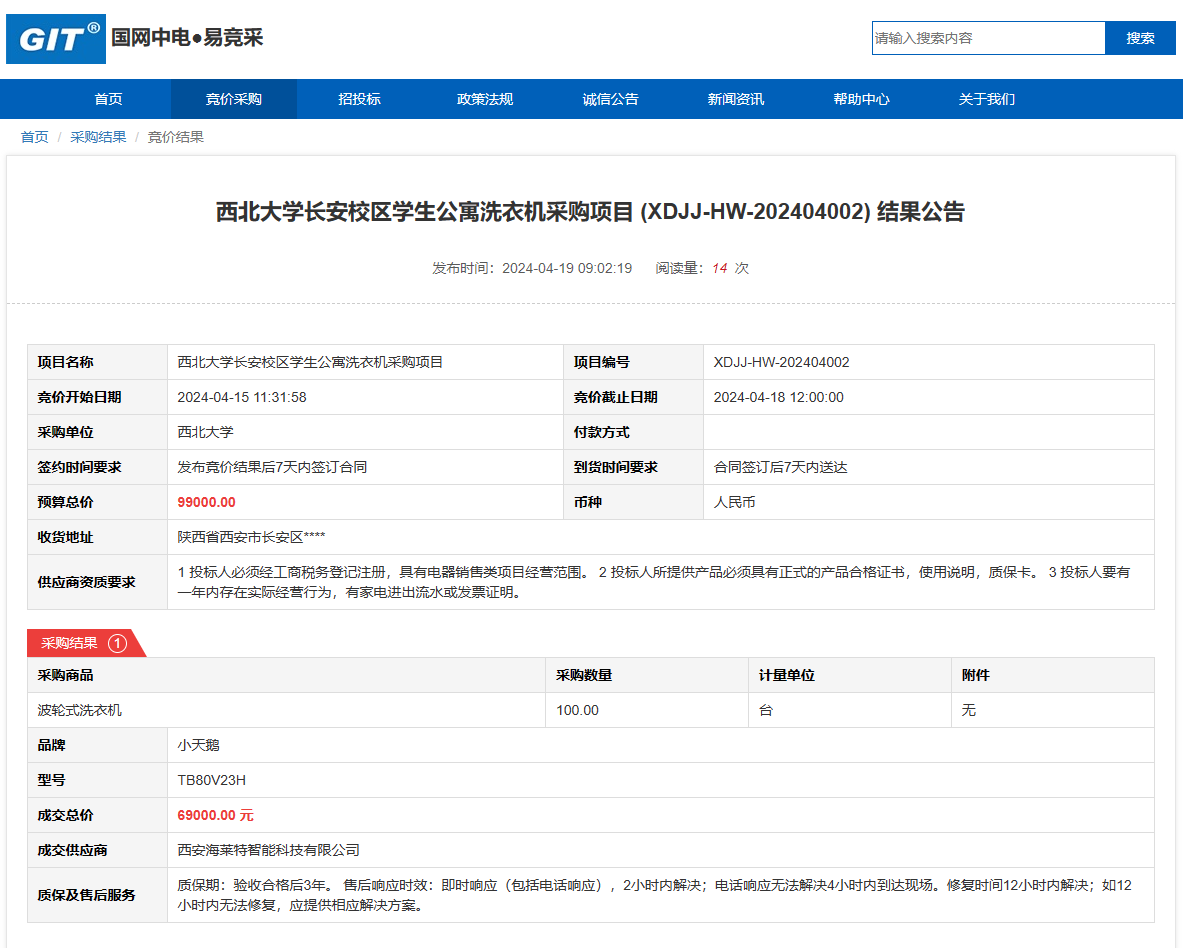 乐投平台长安校区学生公寓洗衣机采购项目 (XDJJ-HW-202404002) 竞价结果公告 作者: 编辑: 时间:2024-04-19 原公告链接:https://www.ejingcai.com.cn/site/bidding/detail/9576