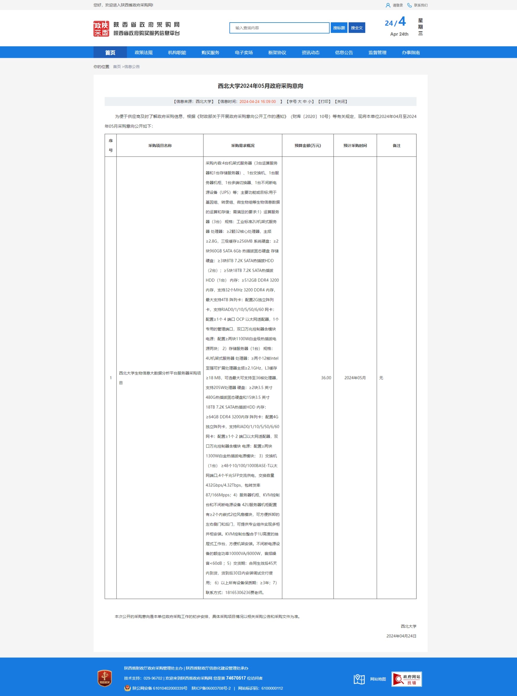 乐投平台2024年05月政府采购意向 作者: 编辑:采购与招标办公室 时间:2024-04-24 原公告链接:https://www.ccgp-shaanxi.gov.cn/freecms/site/shaanxi/ggxx/info/2024/8a69c67a8f0e0cfb018f0e3fa1d20f61.html?noticeType=59¬iceId=66e64df3-0213-11ef-b8b6-08c0eb20c666