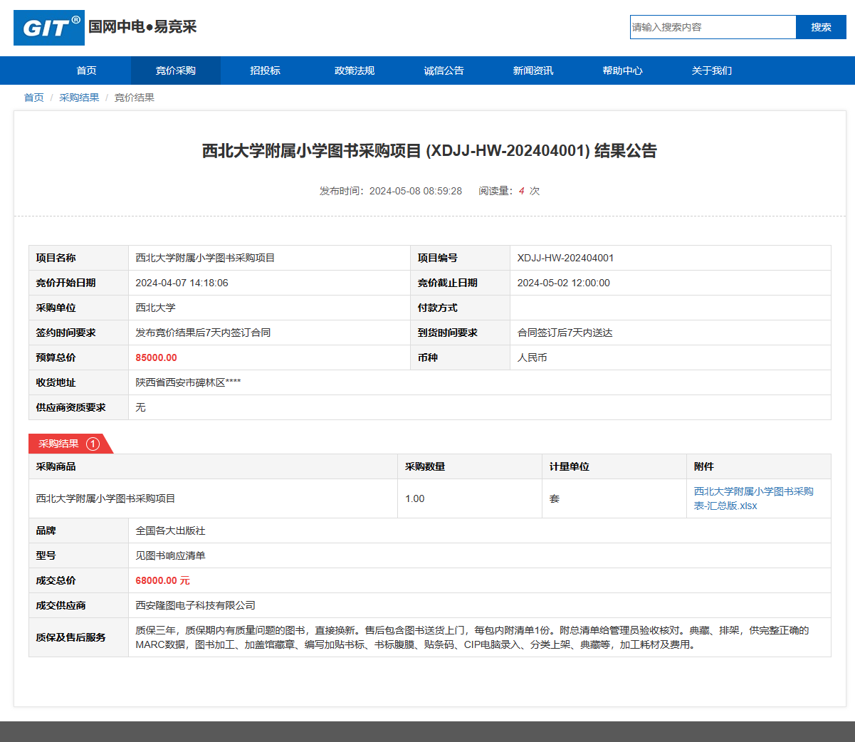 乐投平台附属小学图书采购项目 (XDJJ-HW-202404001) 竞价结果公告 作者: 编辑: 时间:2024-05-08 原公告链接:https://www.ejingcai.com.cn/site/bidding/detail/10017