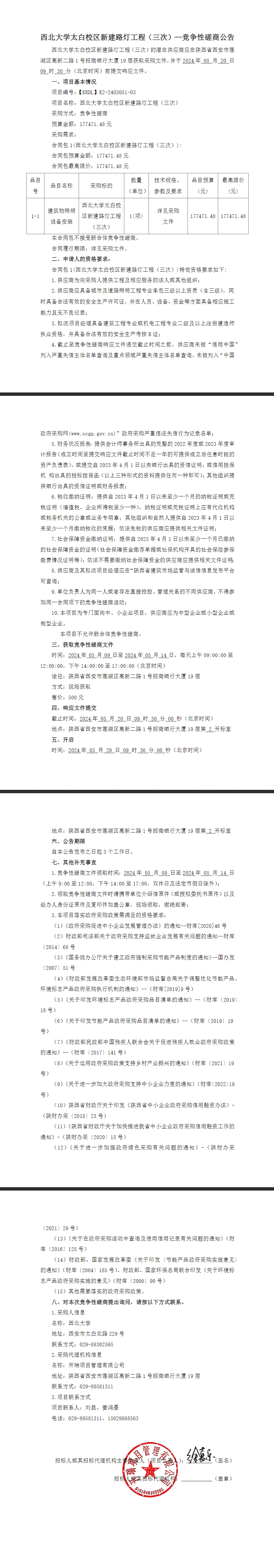 乐投平台太白校区新建路灯工程(三次)竞争性磋商公告