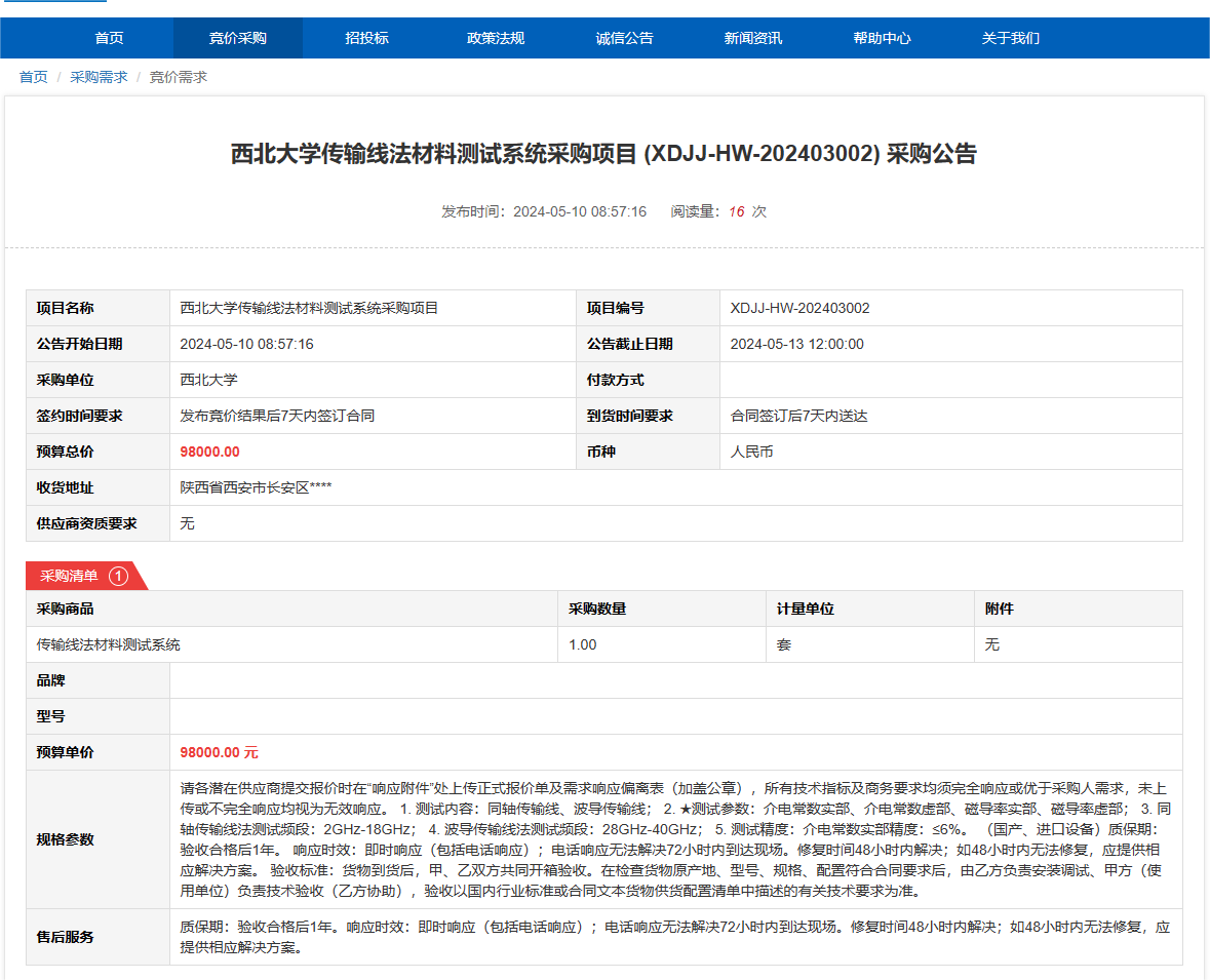 乐投平台传输线法材料测试系统采购项目 (XDJJ-HW-202403002) 竞价采购公告 作者: 编辑: 时间:2024-05-10 原公告链接:https://www.ejingcai.com.cn/site/bidding/detail/10045
