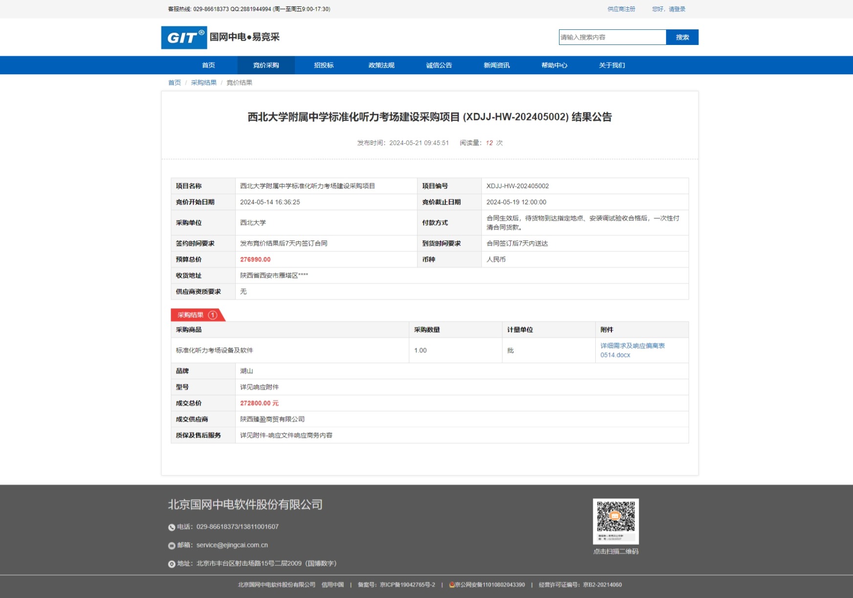 乐投平台附属中学标准化听力考场建设采购项目 (XDJJ-HW-202405002)竞价 结果公告 作者: 编辑:采购与招标办公室 时间:2024-05-21 原公告链接:https://www.ejingcai.com.cn/site/bidding/detail/10341