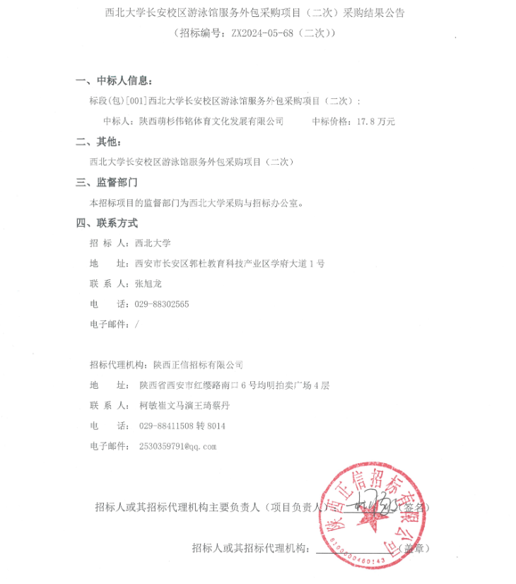 乐投平台长安校区游泳馆服务外包采购项目(二次)采购结果公告