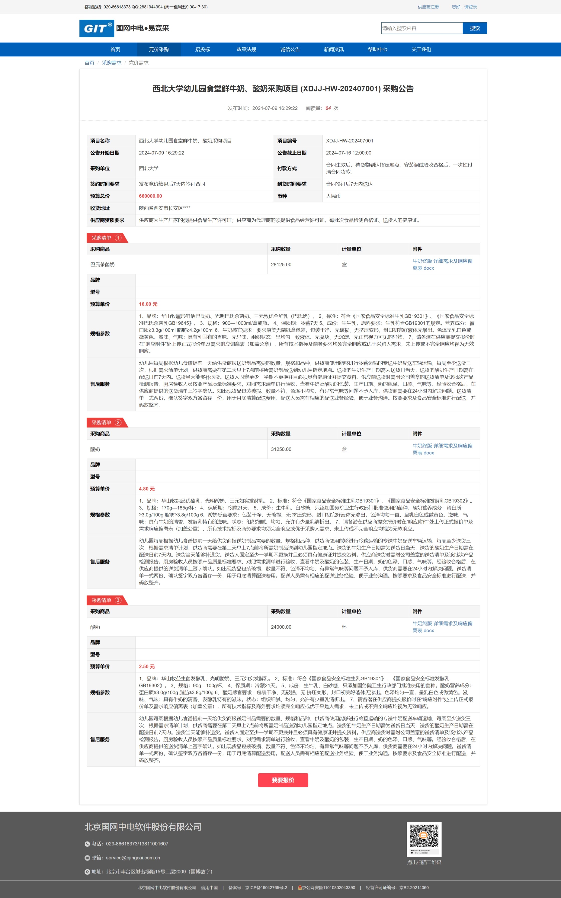 乐投平台幼儿园食堂鲜牛奶、酸奶采购项目 (XDJJ-HW-202407001) 竞价采购公告 作者: 编辑:采购与招标办公室 时间:2024-07-15 原公告链接:https://www.ejingcai.com.cn/site/bidding/detail/11568