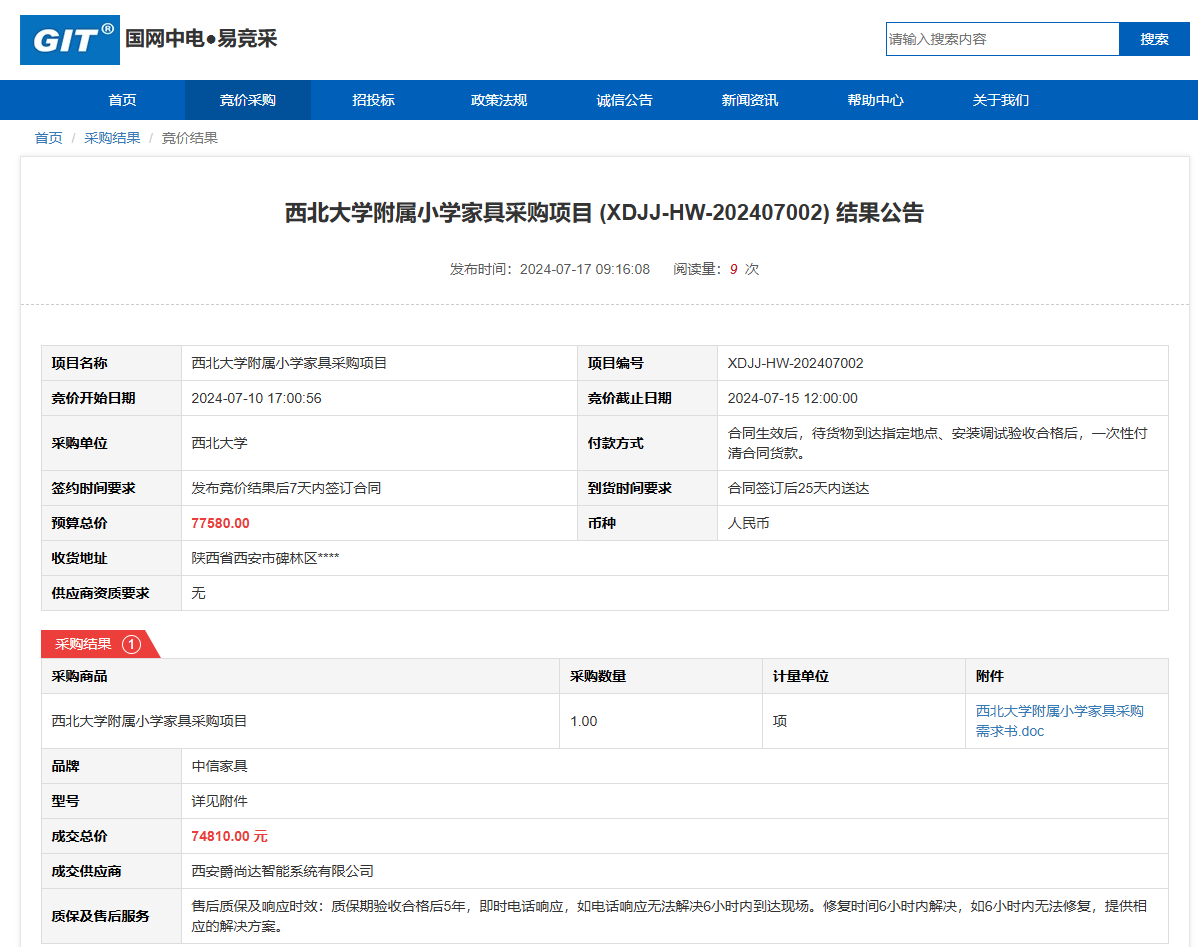 乐投平台附属小学家具采购项目 (XDJJ-HW-202407002) 竞价结果公告 作者: 编辑: 时间:2024-07-17 原公告链接:https://www.ejingcai.com.cn/site/bidding/detail/11713
