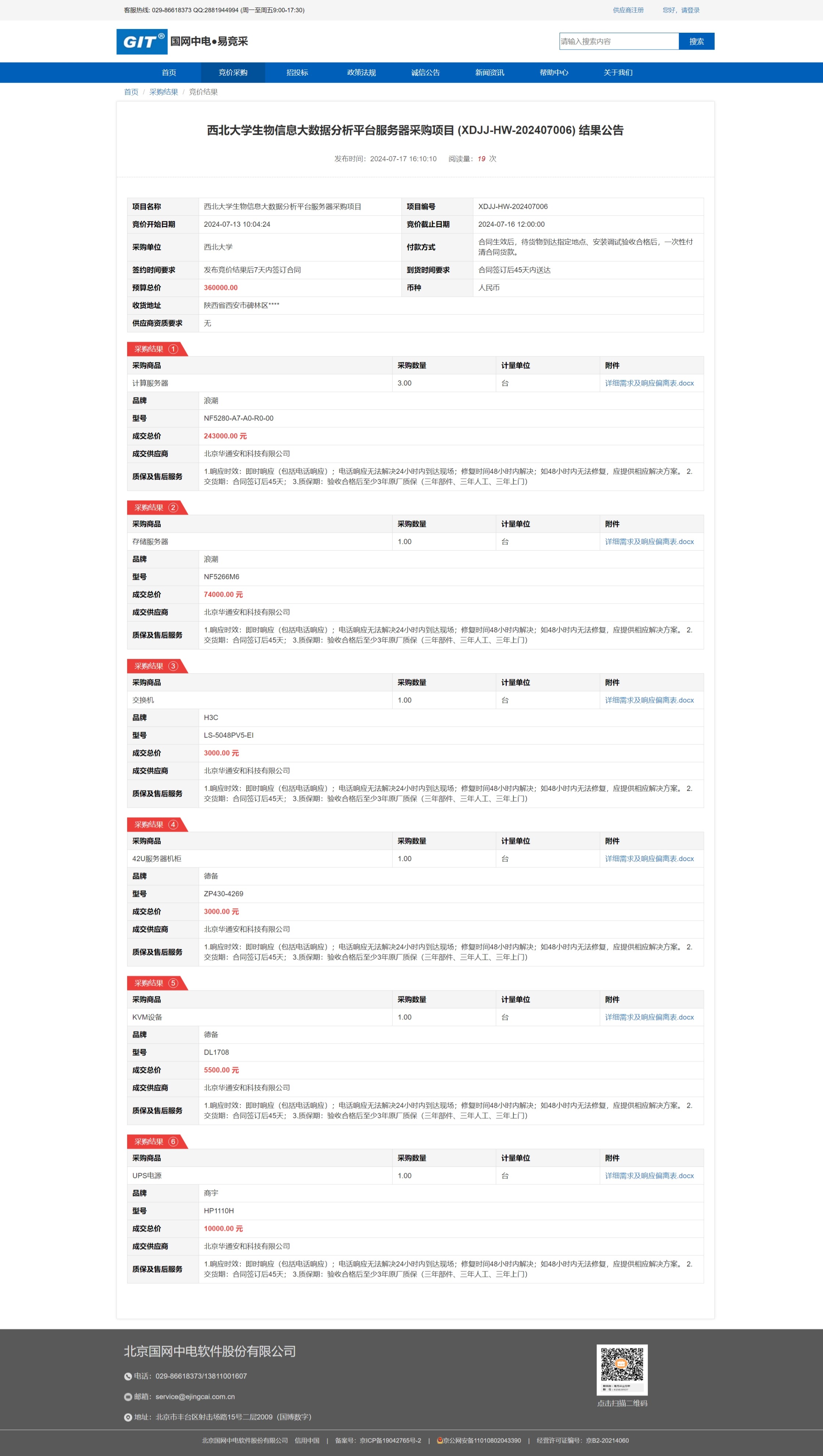 乐投平台生物信息大数据分析平台服务器采购项目 (XDJJ-HW-202407006) 竞价结果公告 作者: 编辑:采购与招标办公室 时间:2024-07-17 原公告链接:https://www.ejingcai.com.cn/site/bidding/detail/11726