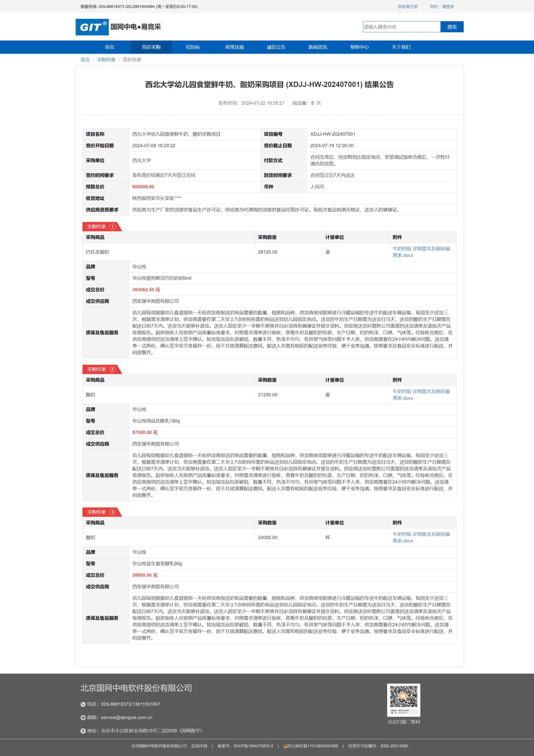 乐投平台幼儿园食堂鲜牛奶、酸奶采购项目 (XDJJ-HW-202407001) 竞价结果公告 作者: 编辑:采购与招标办公室 时间:2024-07-22 原公告链接:https://www.ejingcai.com.cn/site/bidding/detail/11809