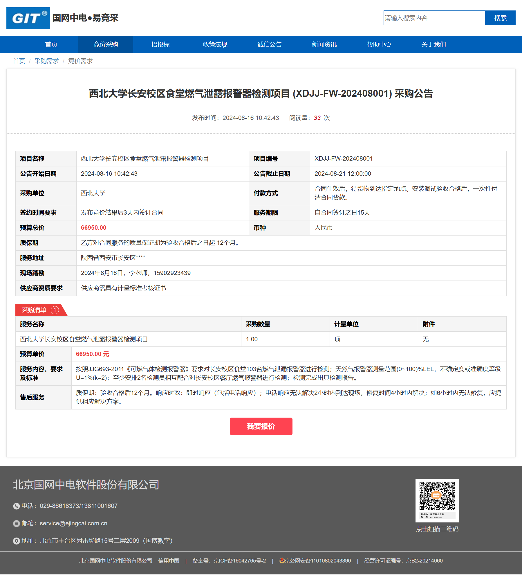 乐投平台长安校区食堂燃气泄露报警器检测项目 (XDJJ-FW-202408001) 竞价采购公告 作者: 编辑: 时间:2024-08-16 原公告链接:https://www.ejingcai.com.cn/site/bidding/detail/12125