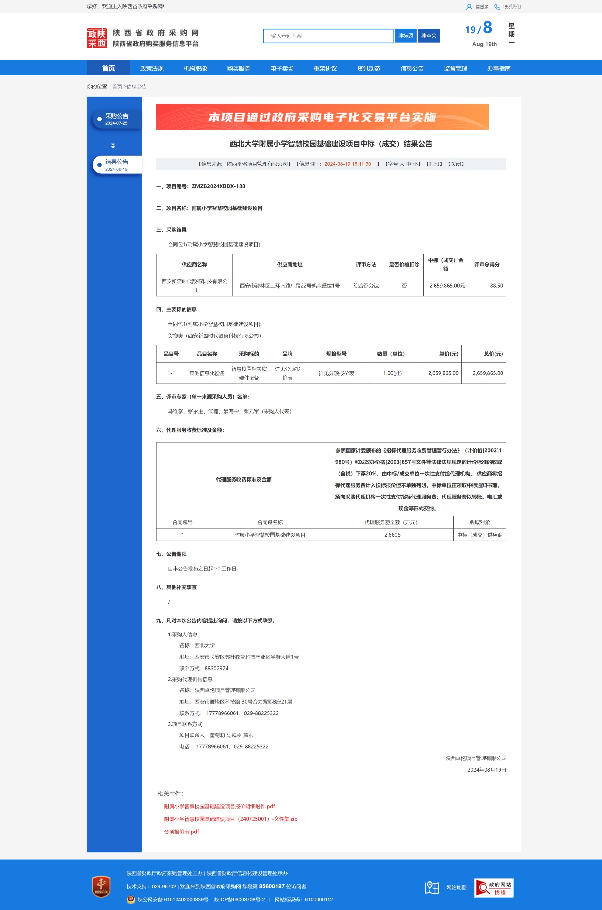 乐投平台附属小学智慧校园基础建设项目中标(成交)结果公告 作者: 编辑:采购与招标办公室 时间:2024-08-19 原公告链接:https://www.ccgp-shaanxi.gov.cn/freecms/site/shaanxi/ggxx/info/2024/8a69c59190e5cfc2019169a684362a48.html?noticeType=001021¬iceId=0d83c93b-5e04-11ef-8063-08c0eb20c666