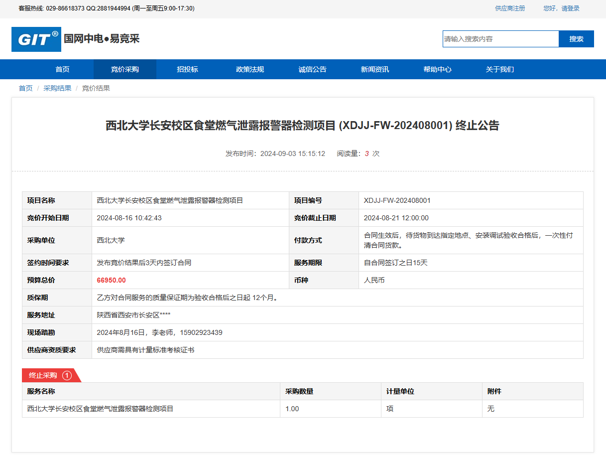 乐投平台长安校区食堂燃气泄露报警器检测项目 (XDJJ-FW-202408001) 竞价终止公告 作者: 编辑: 时间:2024-09-03 原公告链接:https://www.ejingcai.com.cn/site/bidding/detail/12307