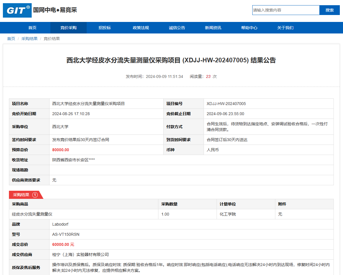 乐投平台经皮水分流失量测量仪采购项目 (XDJJ-HW-202407005) 竞价结果公告 作者: 编辑: 时间:2024-09-09 原公告链接:https://www.ejingcai.com.cn/site/bidding/detail/12405