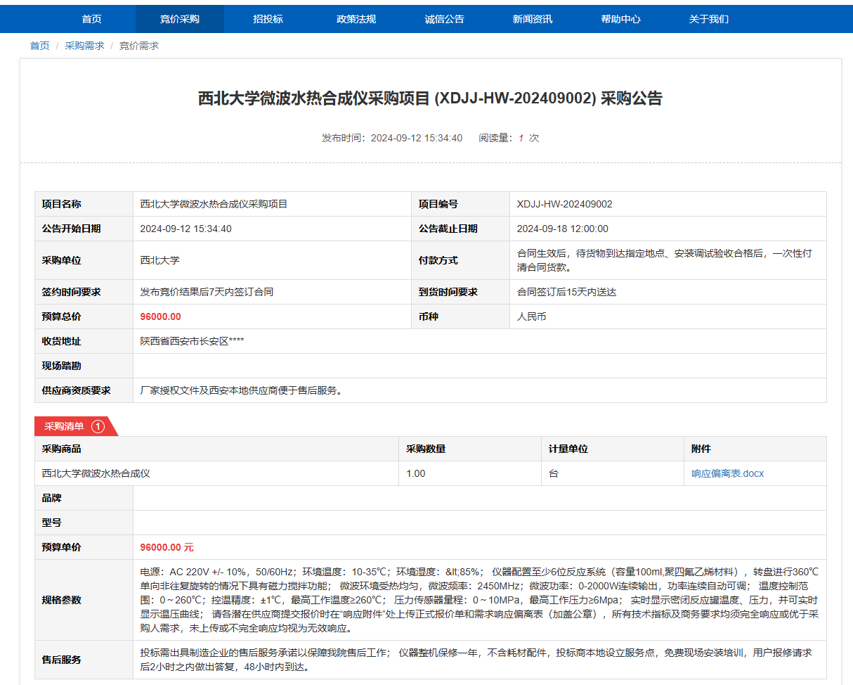 乐投平台微波水热合成仪采购项目 (XDJJ-HW-202409002)竞价采购公告 作者: 编辑: 时间:2024-09-12 原公告链接:https://www.ejingcai.com.cn/site/bidding/detail/12527