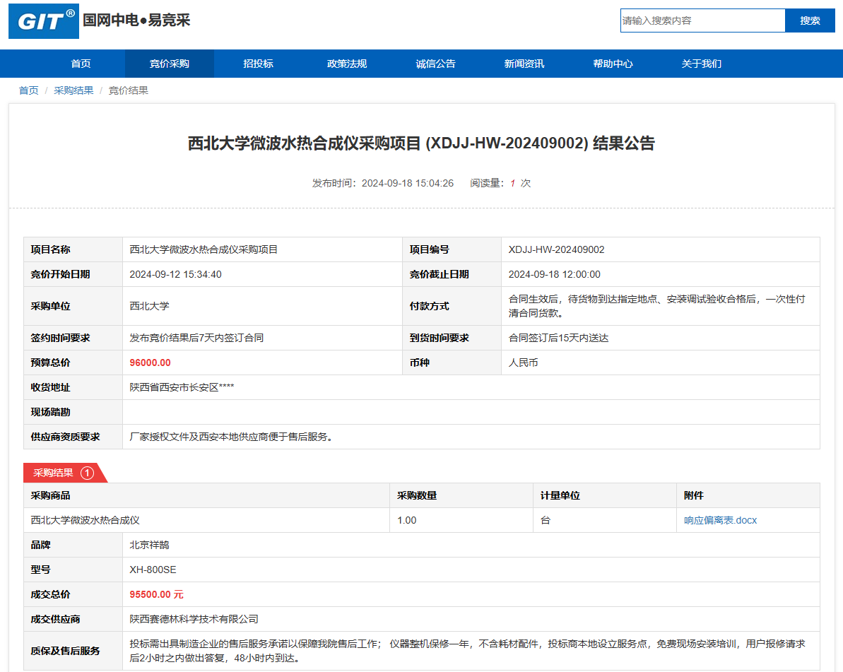 乐投平台微波水热合成仪采购项目 (XDJJ-HW-202409002)竞价结果公告 作者: 编辑: 时间:2024-09-18 原公告链接:https://www.ejingcai.com.cn/site/bidding/detail/12667