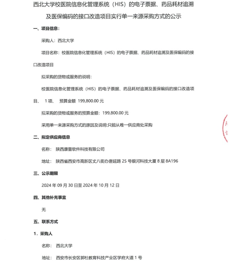 乐投平台校医院信息化管理系统(HIS)电子票据、药品耗材追溯及医保编码接口改造服务项目实行单一来源采购方式的公示