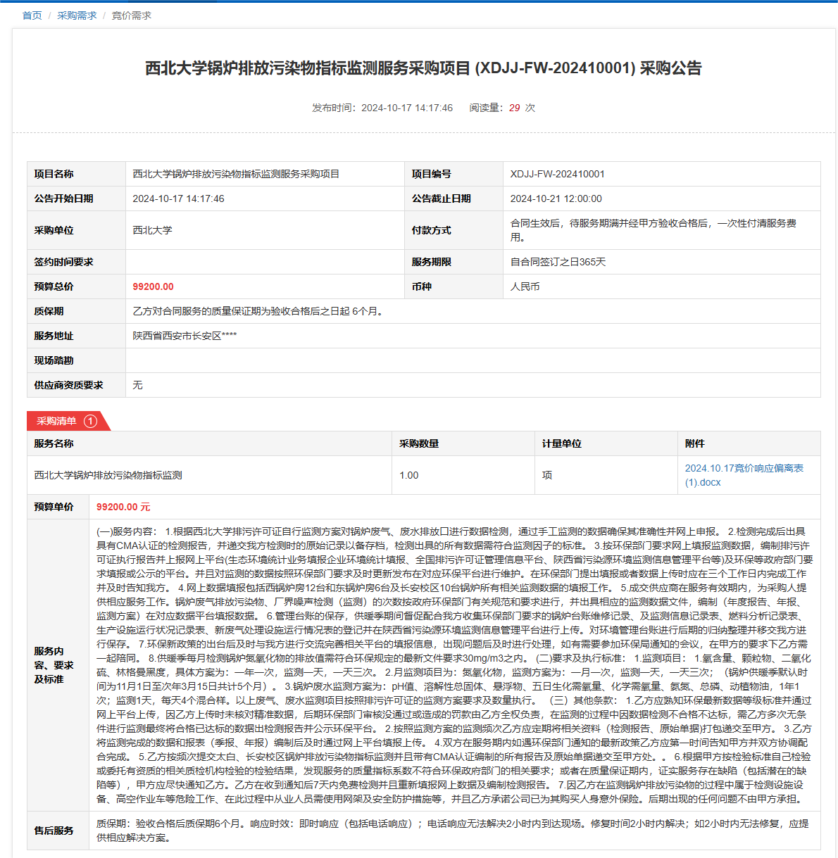 乐投平台锅炉排放污染物指标监测服务采购项目(XDJJ-FW-202410001)竞价采购公告 作者:采购与招标办公室 编辑: 时间:2024-10-18 原公告链接:https://www.ejingcai.com.cn/site/bidding/detail/13425