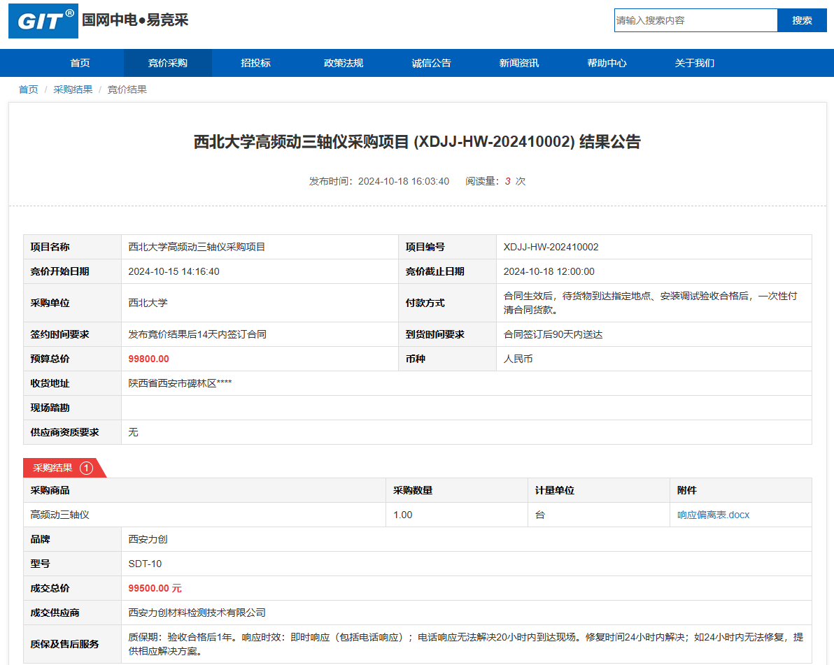 乐投平台高频动三轴仪采购项目(XDJJ-HW-202410002)竞价结果公告 作者:采购与招标办公室 编辑: 时间:2024-10-18 原公告链接:https://www.ejingcai.com.cn/site/bidding/detail/13488