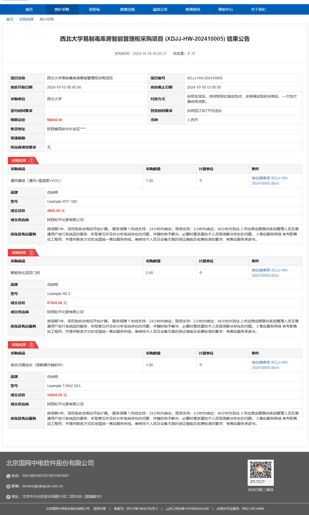 乐投平台易制毒库房智能管理柜采购项目(XDJJ-HW-202410005)竞价结果公告 作者:采购与招标办公室 编辑: 时间:2024-10-18 原公告链接:https://www.ejingcai.com.cn/site/bidding/detail/13487