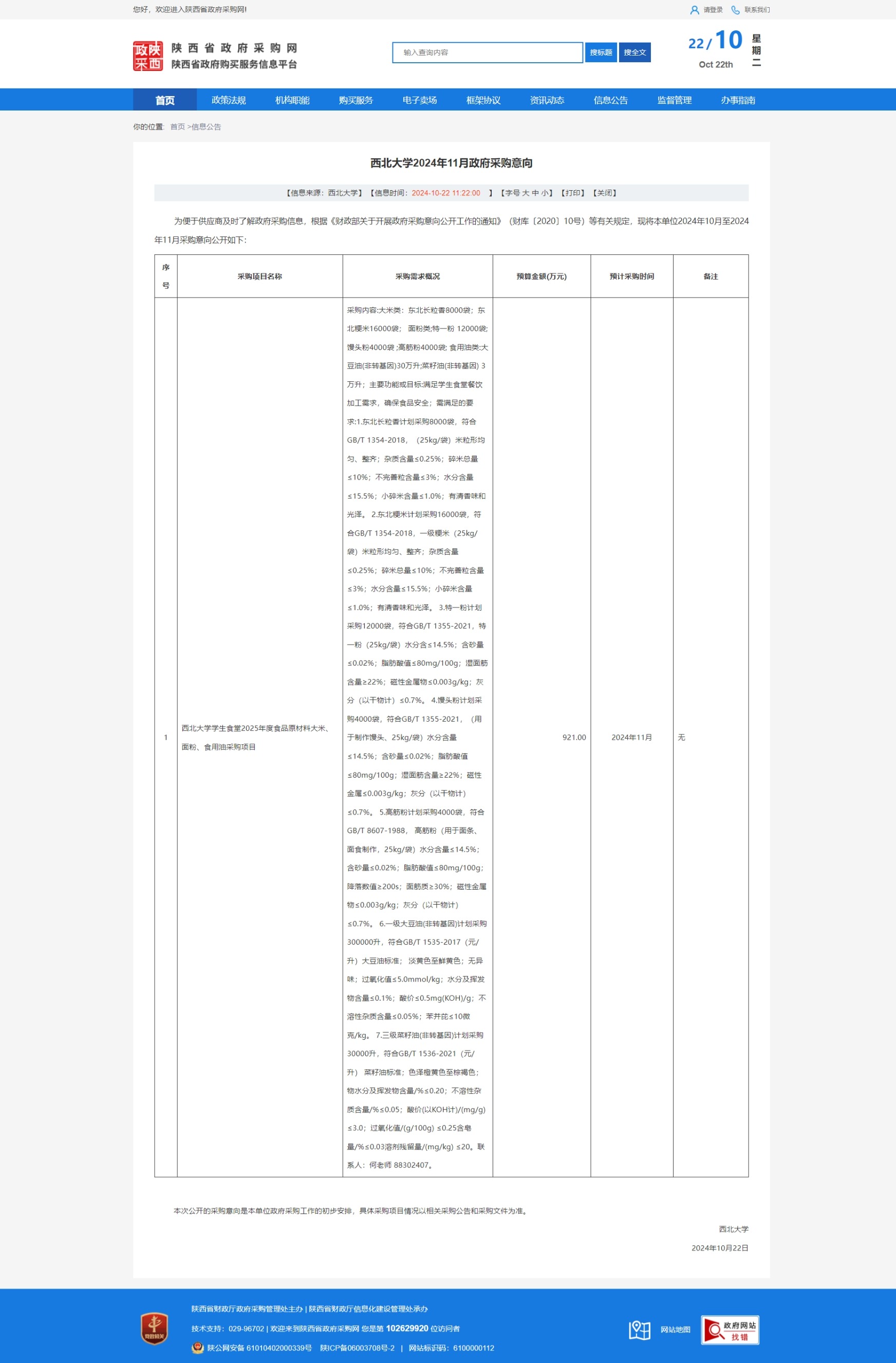 乐投平台2024年11月政府采购意向(后勤集团食堂米面油项目) 作者: 编辑:采购与招标办公室 时间:2024-10-22 原公告链接:https://www.ccgp-shaanxi.gov.cn/freecms/site/shaanxi/ggxx/info/2024/8a69c95c927dd5a50192b23d9b3031d6.html?noticeType=59¬iceId=5795f07a-9026-11ef-8063-08c0eb20c666